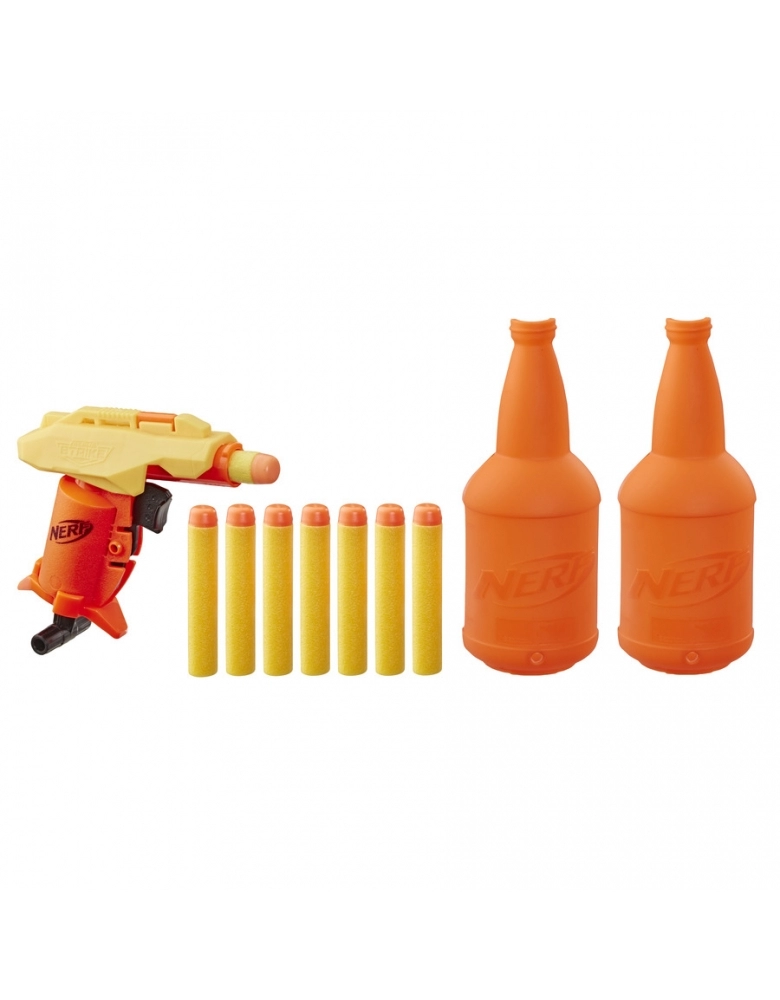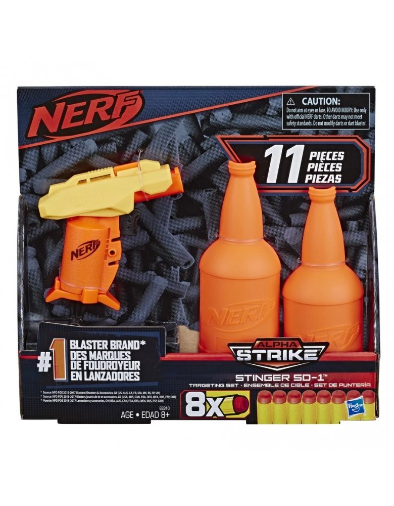 A brincadeira completa de Nerf com a linha Alphastrike! Pratique suas habilidades com o novo Kit Nerf Alphastrike Stinger com target! Ele inclui 1 lançador Stinger, 1 alvo em formato de garrafa e 8 dardos Nerf Elite! Quando acertado, o alvo de garrafa se quebra em 2 para uma brincadeira mais realista! Pode ser usado como 2 meio-alvos ou encaixados para formar 1 garrafa inteira. Este compacto lançador é ótimo para carregar para qualquer lugar e se locomover durante os desafios Nerf!