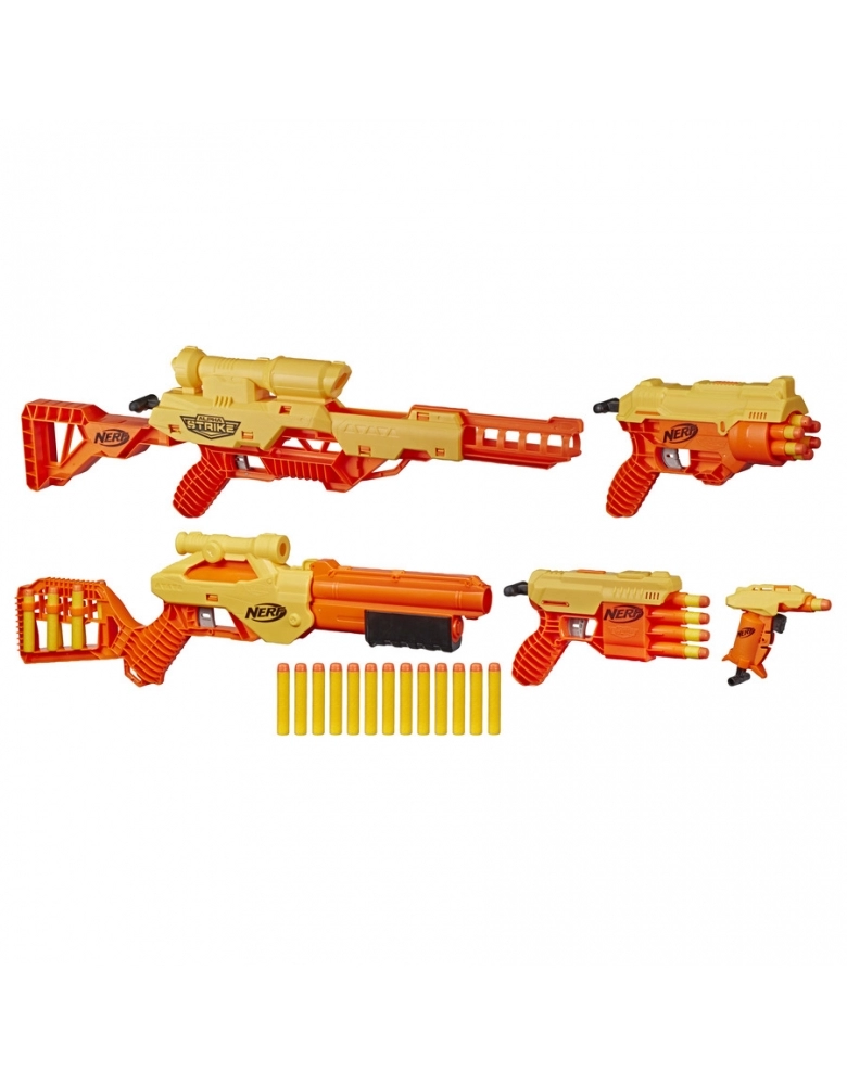 Este item possui 35 peças inclui 5 lançadores e 30 dardos! Vem com uma Stinger SD-1, uma Fang QS-4, uma Cobra RC-6, uma Wolf LR-1 e um Lynx SD-1. Eles são fáceis de usar: carregue, inicie e dispare em algumas etapas rápidas. Inclui 30 dardos oficiais Nerf Elite. Os lançadores da linha de AlphaStrike são uma ótima maneira de entrar no mundo Nerf e experimentar o poder e o desempenho da marca.