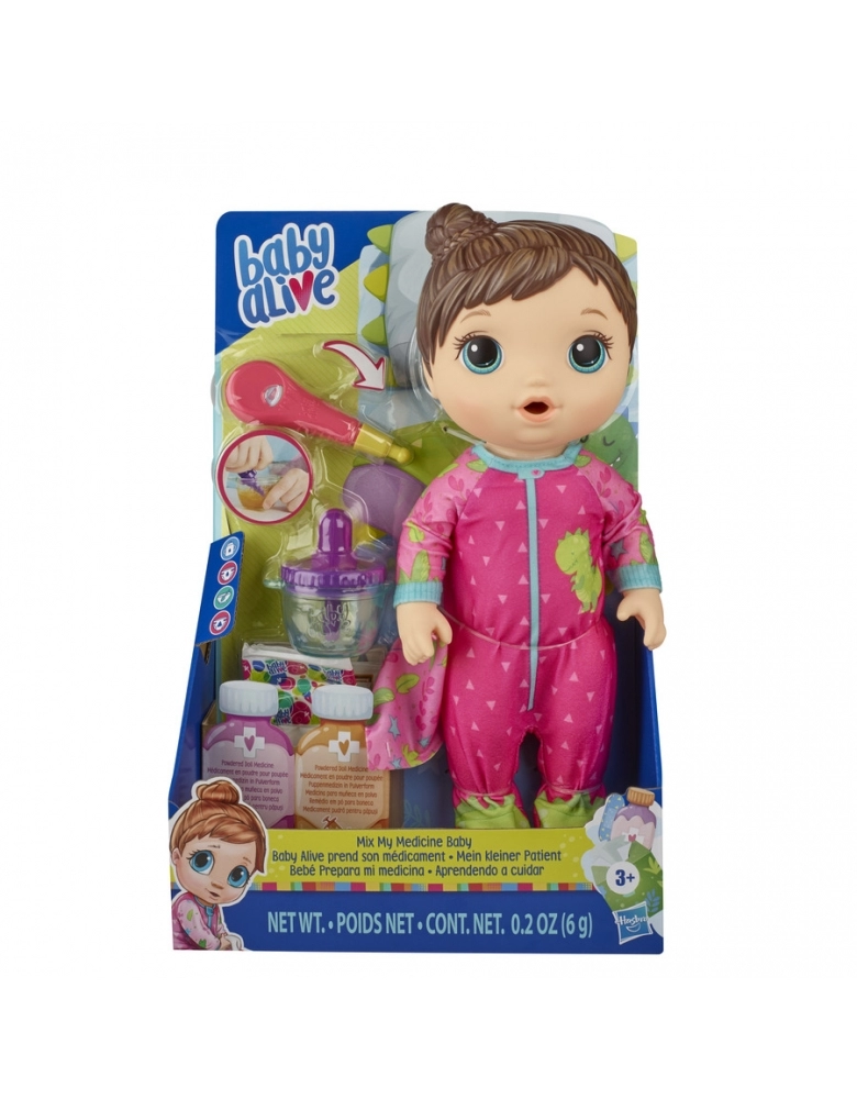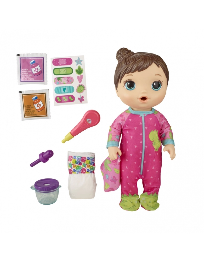 Bebê está em casa na cama porque não está se sentindo bem. Descubra o que há de errado! Use o termômetro interativo para dizer como cuidar dela. Prepare o remédio e depois alimente-a para elas se sentir melhor! Ela vem de pijama adorável para os dias doentes em casa.