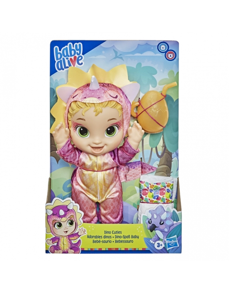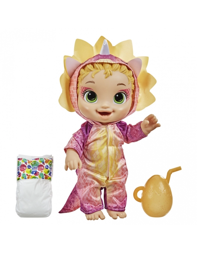 EMBALAGEM SEM PLÁSTICO - Esta é a boneca Baby Alive Bebessauro: uma linda dinossaura que está sempre pronta para brincar. Quais aventuras as crianças vão imaginar com ela: um safari na floresta ou um chá da tarde com todas as bonecas Bebessauro? Esta linda boneca Bebessauro vem com uma roupa de dinossauro colorida com capuz e uma mamadeira em formato de ovo de dinossauro. Ela até vem com pintura de rosto inspirada num réptil. As bonecas Baby Alive Bebessauro bebem água e fazem xixi como bebês de verdade. Crianças a partir dos 3 anos vão se divertir ao alimentar e trocar a fraldinha da boneca Bebessauro. É um excelente presente de aniversário ou outras celebrações (bonecas e fraldas adicionais vendidas separadamente e sujeitas à disponibilidade). Baby Alive e todas as propriedades relacionadas são marcas registradas da Hasbro.