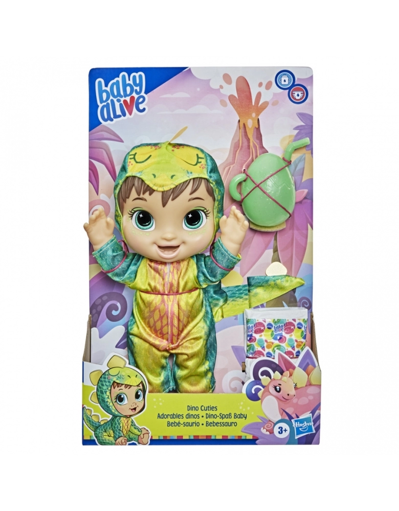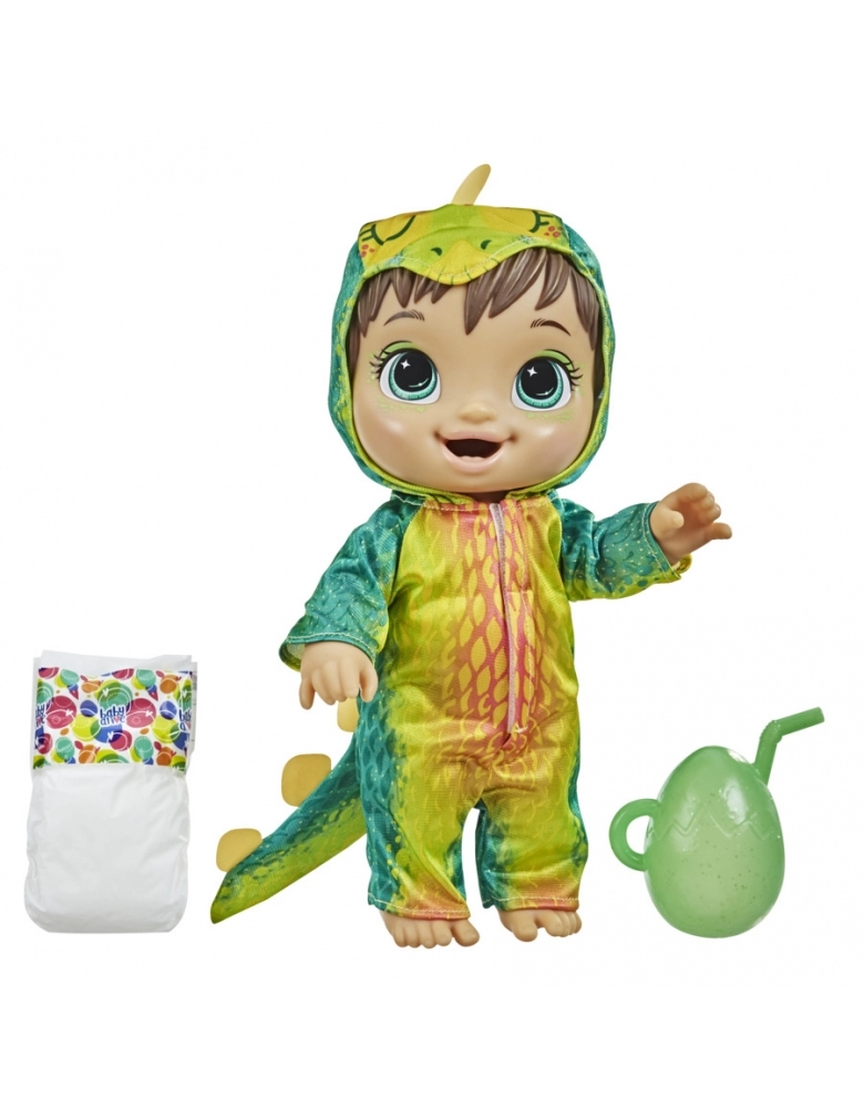 EMBALAGEM SEM PLÁSTICO - Esta é a boneca Baby Alive Bebessauro: uma linda dinossaura que está sempre pronta para brincar. Quais aventuras as crianças vão imaginar com ela: um safari na floresta ou um chá da tarde com todas as bonecas Bebessauro? Esta linda boneca Bebessauro vem com uma roupa de dinossauro colorida com capuz e uma mamadeira em formato de ovo de dinossauro. Ela até vem com pintura de rosto inspirada num réptil. As bonecas Baby Alive Bebessauro bebem água e fazem xixi como bebês de verdade. Crianças a partir dos 3 anos vão se divertir ao alimentar e trocar a fraldinha da boneca Bebessauro. É um excelente presente de aniversário ou outras celebrações (bonecas e fraldas adicionais vendidas separadamente e sujeitas à disponibilidade). Baby Alive e todas as propriedades relacionadas são marcas registradas da Hasbro.