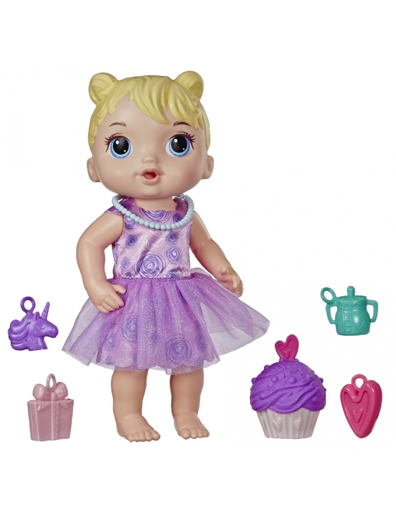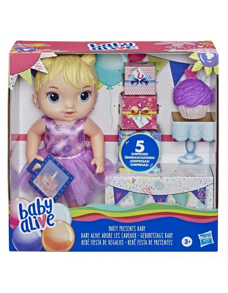 A Baby Alive Bebe Festa de Presentes vem pronta para a festa! Esse bebe esta toda vestida para um dia especial! A boneca vem com um colar que pode virar pulseira, quatro pingentes, dois convites e um cup cake que funciona como um esconderijo.