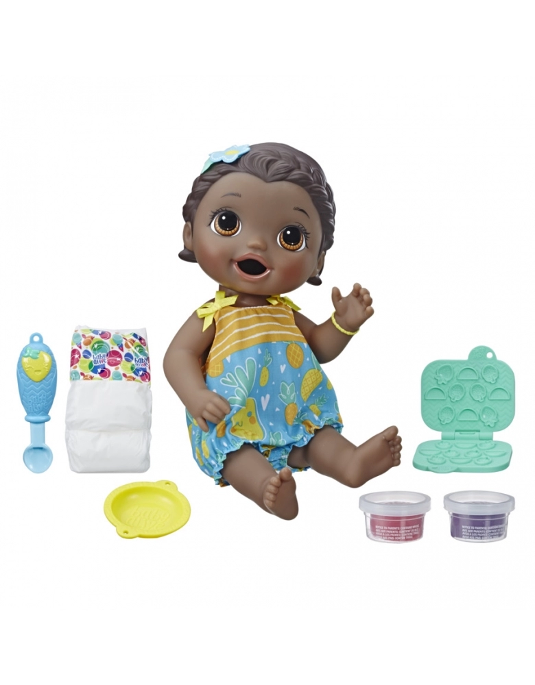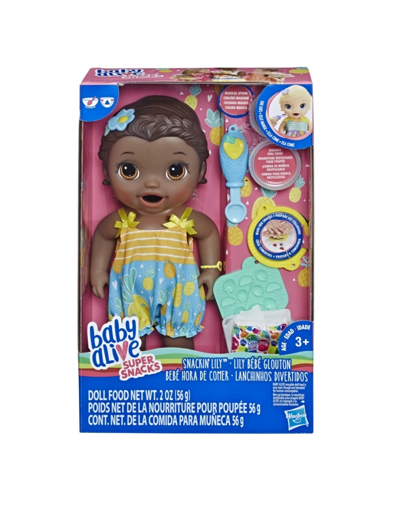 Atualizando as estampas das roupas, acessório para o cabelo, cores acessórias + enfeites para os olhos Lanchinhos Divertidos (Snackin' Lily) é uma menininha com um grande apetite! Ela adora comer a comidinha que vem no aviãozinho; sempre funciona. Parte da linha Super Snacks, a Lanchinhos Divertidos (Snackin' Lily) faz lanchinhos de comida sólida para boneca. É possível criar lanchinhos de frutas e usar a colher especial para dar comidinha a ela. Então chega a hora de trocar a fralda! A Lanchinhos Divertidos (Snackin' Lily) vem com roupa removível, 2 potes de comida reutilizável para boneca, uma colher, um prato, um molde para fazer os lanchinhos e uma fralda.
