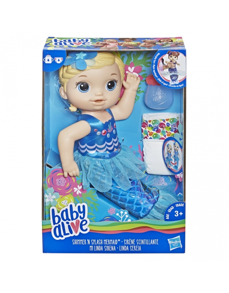 A Baby Alive Linda Sereia é muito divertida dentro e fora da água! Basta puxar a sua saia para transformá-la em uma sereia com uma cauda cintilante e deslumbrante. Agora as crianças estão prontas para brincar na água o dia todo! Quando ela está fora da água, ela bebe na mamadeira e faz xixi. Inclui uma boneca, saia transformável, mamadeira e fralda.