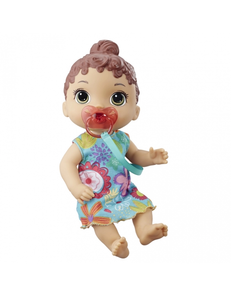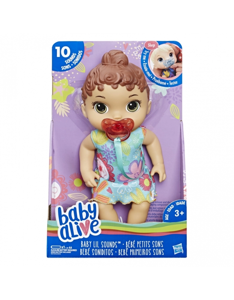 Que boneca bebê divertida! Ela emite doces sons! A Bebê Primeiros Sons da Baby Alive é uma boneca bebê interativa que produz sons reais de bebê quando as crianças brincam com ela. Ela reage quando a colocam para dormir e quando a despertam. Quando ela acorda, as crianças podem vesti-la com o seu vestido removível. Se a bebê ficar irritada, as crianças podem lhe dar a chupeta para acalmá-la e a Bebê Pequenos Sons fará sons de sucção. Ela também reage com sons reais de bebê quando a chupeta é remo