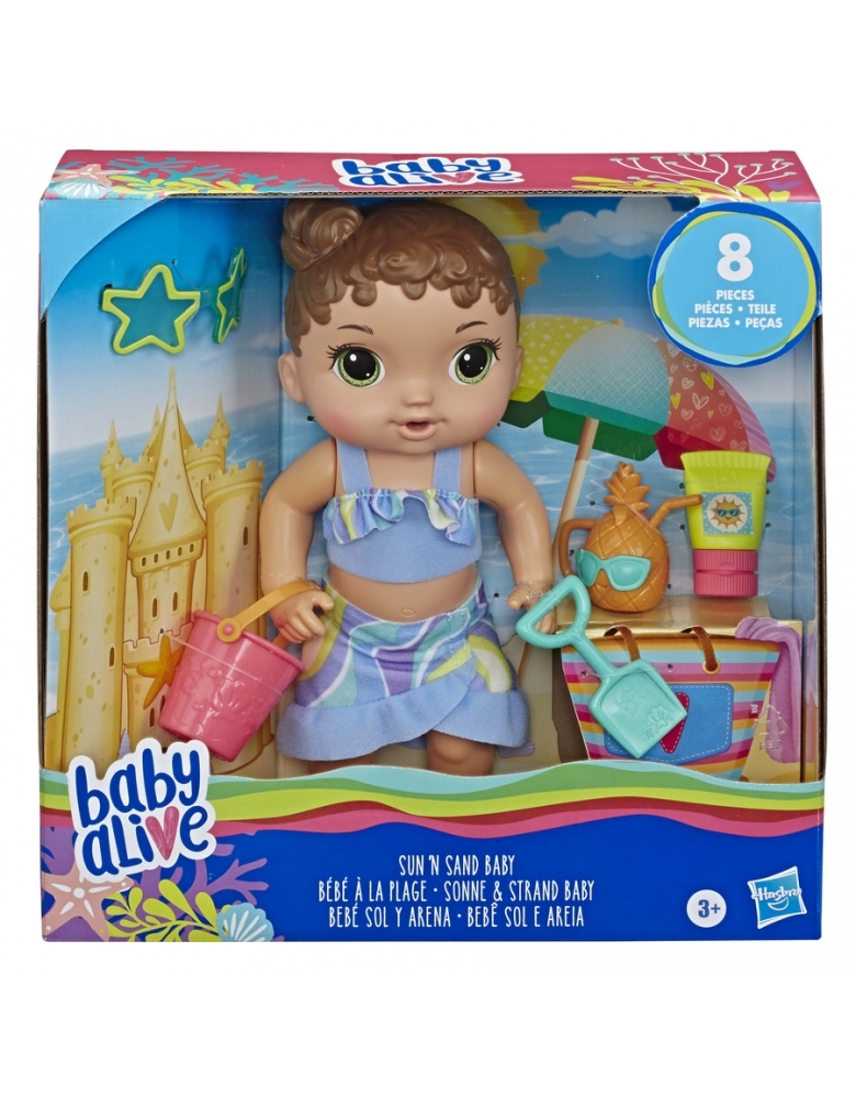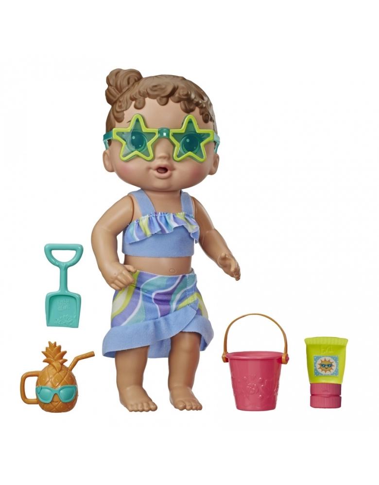 A Baby Alive Bebe Sol e Areia vem pronta para a praia! Esse bebe pode entrar debaixo da agua e aproveitar o dia na praia. A boneca vem com um balde, uma pá, oculos de sol, protetor e um copo.