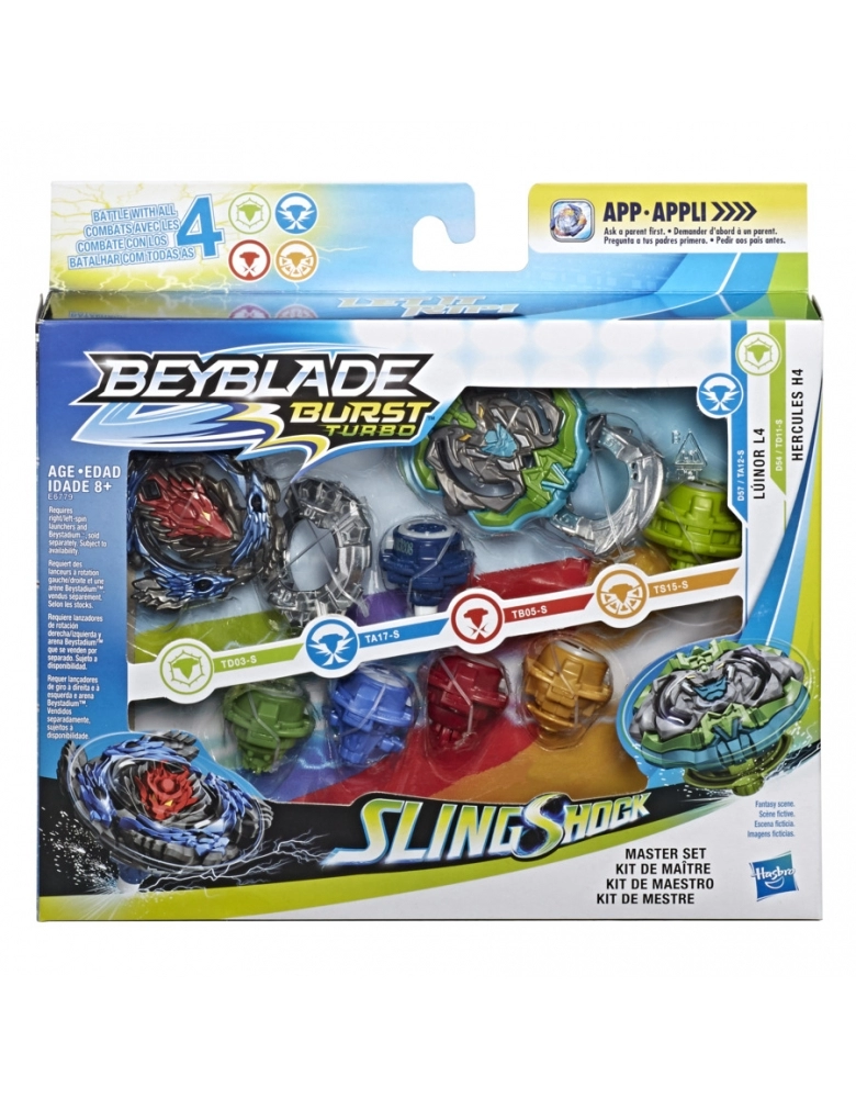 Monte os trilhos e domine a estratégia de batalha com o Slingshock Master Set. Vem com 2 tops completos de Beyblade Burst e 4 pontas de desempenho adicionais. Os bladers podem testar o desempenho do seu top em batalha com qualquer um dos 4 tipos de pontas de desempenho: ataque, resistência, defesa e equilíbrio. Os Bladers podem misturar e combinar os componentes incluídos para tentar encontrar a melhor combinação de Beyblade Burst! As pontas de desempenho do Slingshock têm recursos de trilhos e