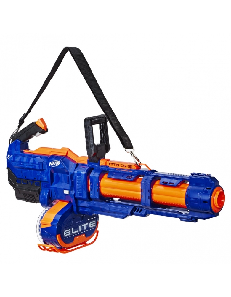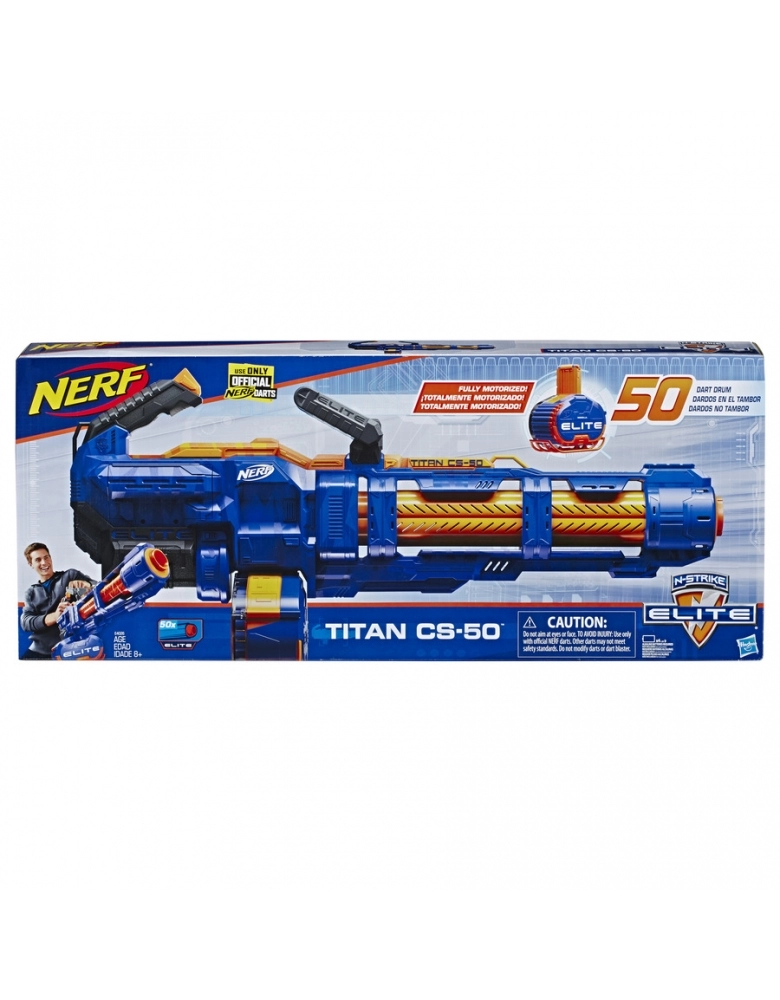 Nerf Titan, potente e rápida, essa Nerf é o possui quase um metro de largura e comporta 50 dardos, é diversão que não irá acabar. Para lançar, bastar acionar o botão de carregar e o cano irá começar a girar, depois aperte para disparar, podendo fazer lançamentos consecutivos ou um a um, é só escolher. Possui um tambor para 50 dardos!