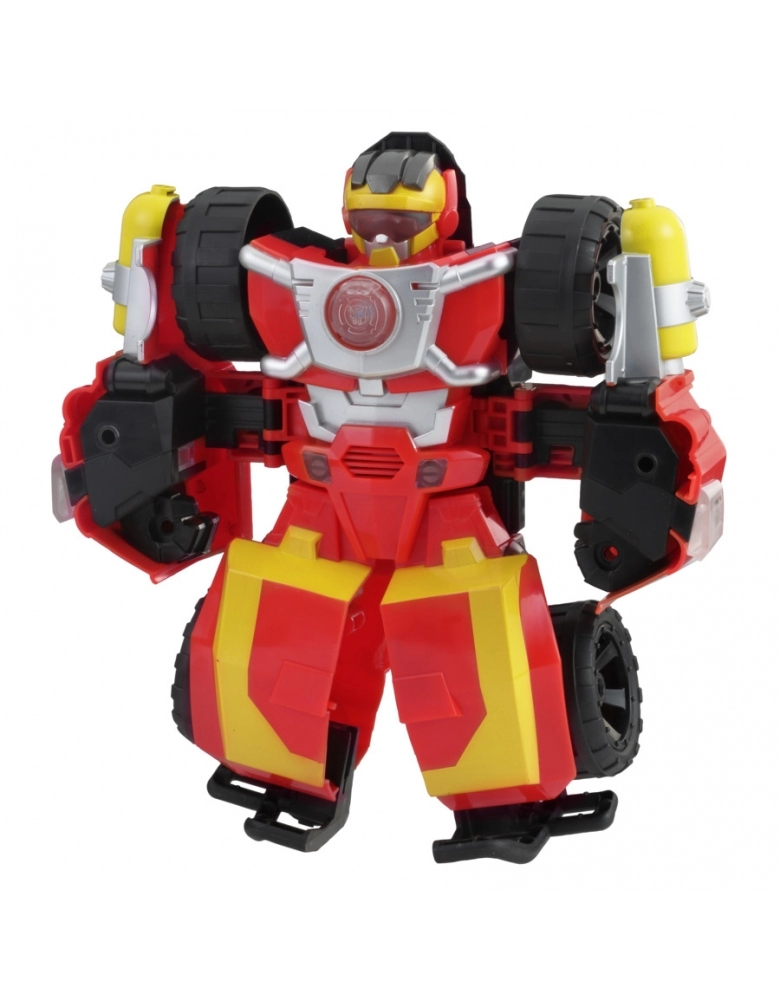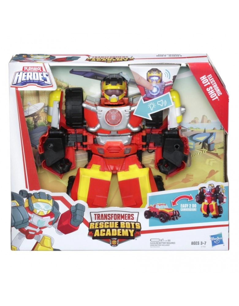Imagine ajudar a Hot Shot a correr para o resgate como um veículo off-road robusto! Com o tamanho certo para mãos pequenas, as crianças podem converter a figura Hot Shot Eletrônica do modo robô para o modo veículo e vice-versa com uma fácil conversão em uma etapa. Os modos veículo e robô apresentam luzes eletrônicas, efeitos sonoros e frases! Robôs e humanos salvando o dia, trabalhando juntos da maneira Rescue Bots!