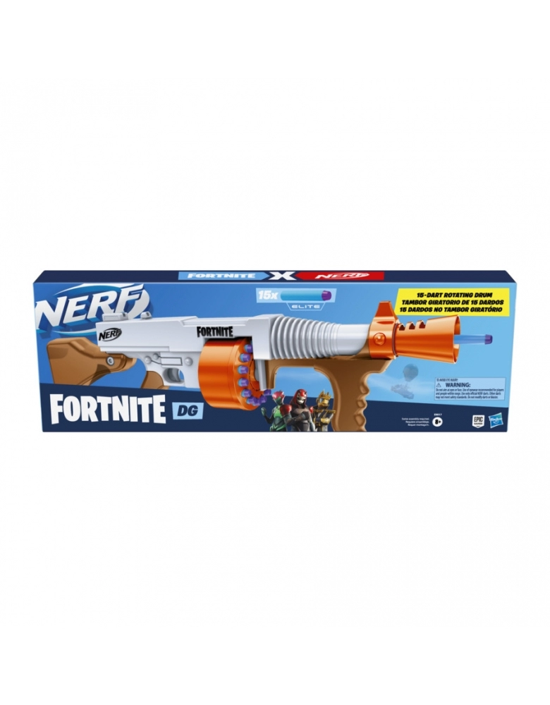 Este lançador de dardos Nerf Fortnite DG é inspirado no videogame Fortnite, capturando a aparência do lançador no popular videogame. Possui um tambor rotativo de 15 dardos, para que se possa lançar 15 dardos seguidos antes de recarregar. O lançador vem com 15 dardos oficiais Nerf Elite, o suficiente para carregar completamente o tambor. A operação manual permite que se jogue rápido - carregar dardos no tambor, bombear o carregador para preparar o lançador e pressionar a alavanca de disparo para lançar 1 dardo. Para lançamentos sucessivos rápidos, basta manter a alavanca de disparo pressionada e continuar movendo o carregador para lançar todos os 15 dardos rapidamente por bombeamento. A aventura fica mais divertida com este lançador multi-dardos inspirado em Fortnite! Recomenda-se o uso de óculos, não inclusos.