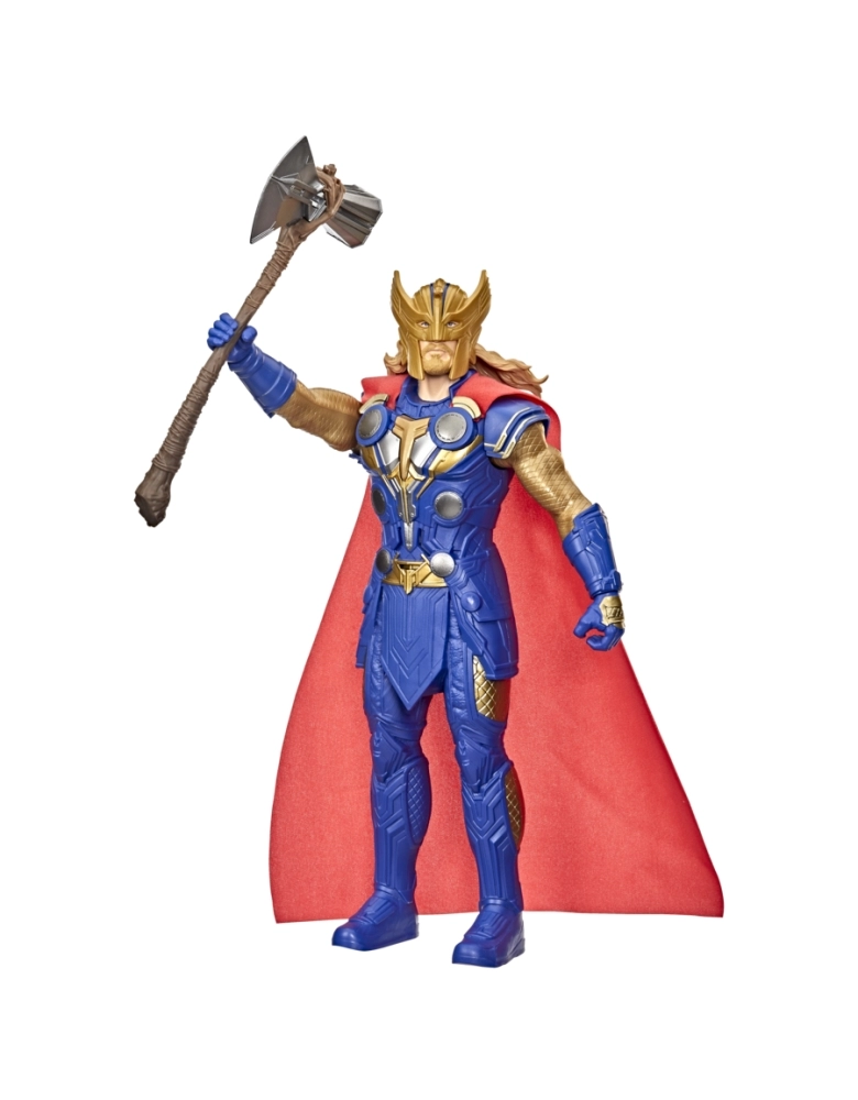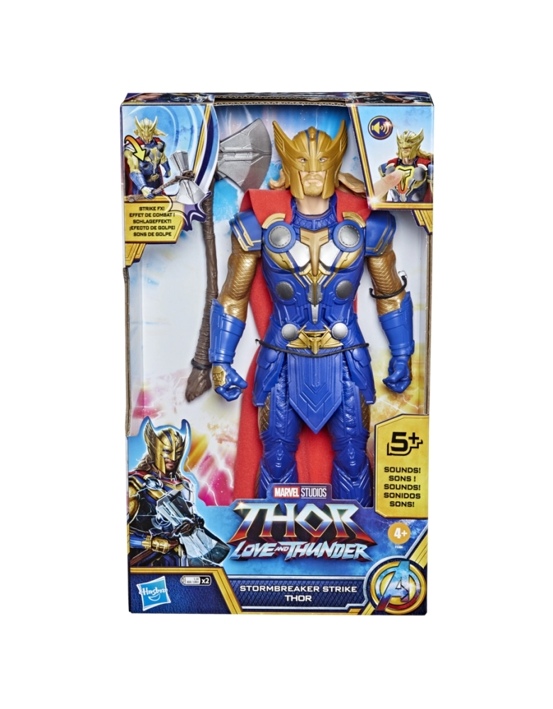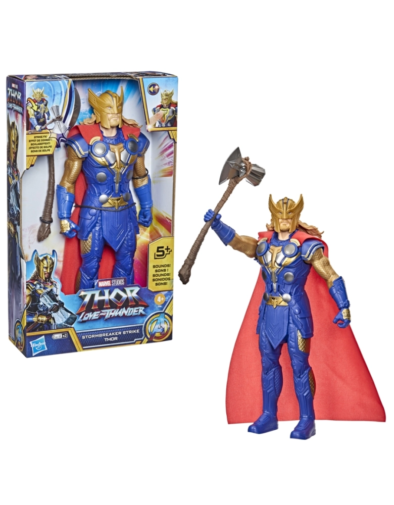 Muito depois de os Vingadores derrotarem Thanos, os Guardiões da Galáxia devem convencer Thor a retornar ao campo de batalha e enfrentar um mal que pode destruir todas as criaturas divinas do cosmos! Liberar o poder de Stormbreaker com a figura de ação eletrônica Stormbreaker Strike Thor da Marvel! ; Crianças a partir dos 4 anos podem se imaginar entrando em uma batalha superpoderosa com este brinquedo Thor em escala de 30 cm, inspirado no Thor: Love and Thunder da Marvel Studios, parte do Cineverso Marvel. Apresentando design e detalhes inspirados no entretenimento, articulação básica e sons, meninos e meninas vão adorar imaginar defender a Nova Asgard com este brinquedo eletrônico Thor em grande escala!
