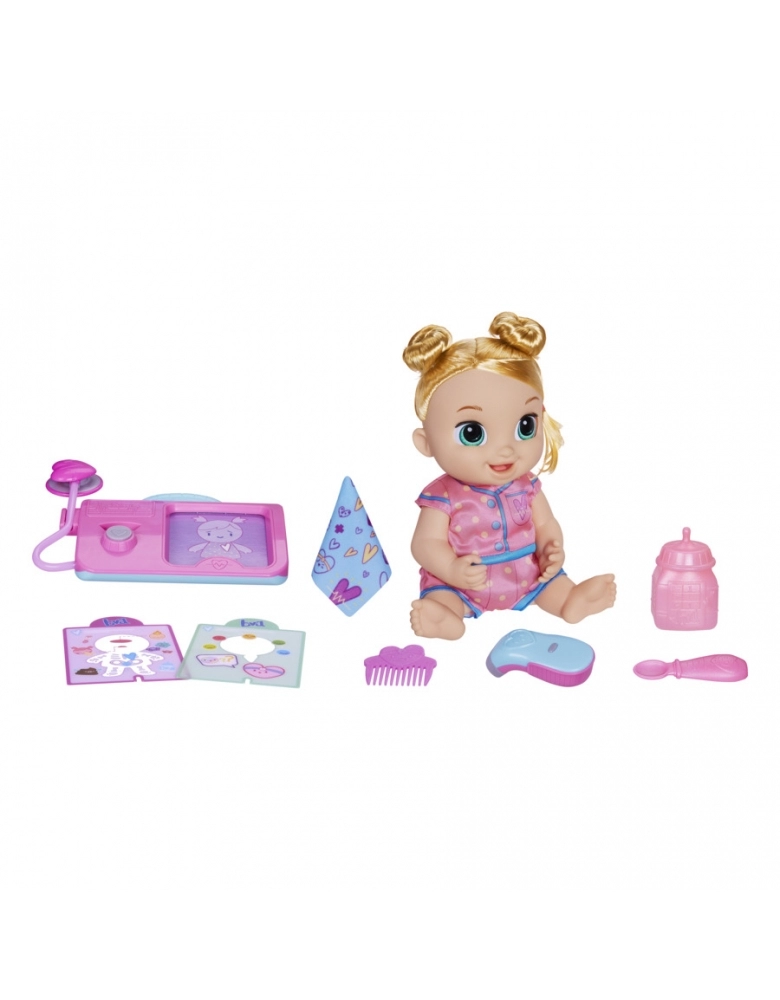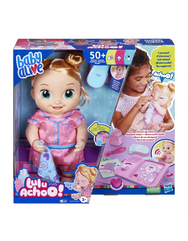 Atchin! Ao espirrar, a boneca move as suas mãos para cobrir o rosto. A boneca interativa emite sons. O nariz e a testa se iluminam para mostrar que a boneca não está se sentindo bem. As crianças a partir dos 3 anos vão se divertir fazendo exames médicos na boneca. Ela precisa de um lenço? Ou ela precisa tomar o seu remédio de mentirinha? As crianças podem usar as ferramentas de médico para descobrir. A sua testa se ilumina com o termômetro e o coração bate com o estetoscópio. A boneca tosse, mover os braços e muito mais. O kit inclui ferramentas como estetoscópio, 2 gráficos, termômetro, lenço, colher, pente e mamadeira. A boneca Baby Alive Lulu Achoo é um excelente presente de aniversário, Natal ou outras celebrações para crianças a partir dos 3 anos.
