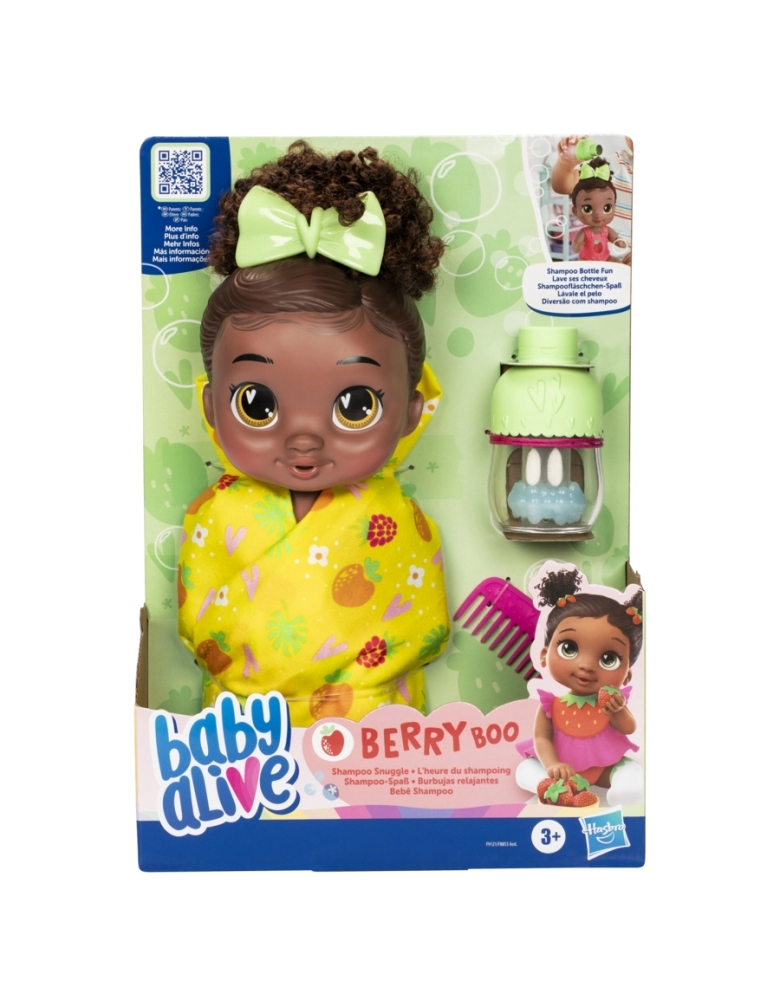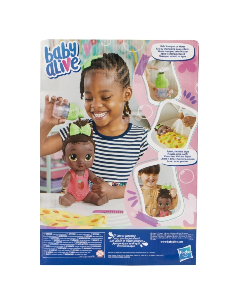 As crianças irão se divertir na hora do banho com sua nova amiga Baby Alive Bebê Shampoo! As crianças podem inclinar o frasco para ver as bolhas de mentirinha subirem e descerem! Pode ser usado vazio, com água ou shampoo infantil. As crianças podem brincar de criar penteados com o pente e laço removível. Enrolar a boneca na toalha macia com fechos para encaixar. As bonecas Baby Alive são um excelente presente para meninos e meninas a partir dos 3 anos.