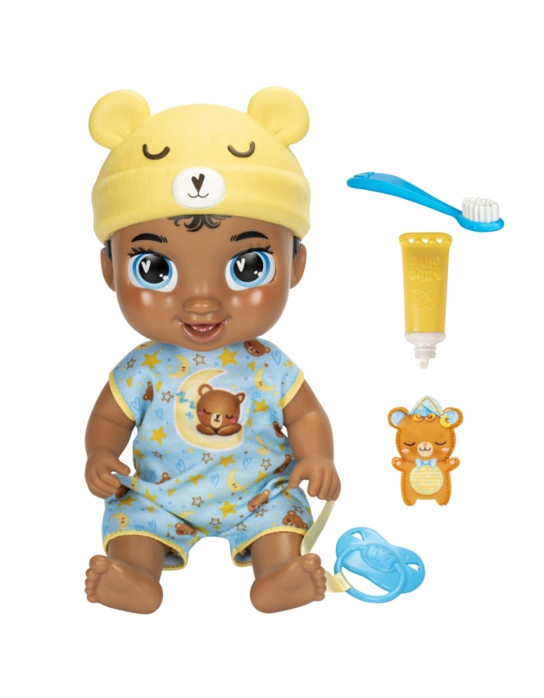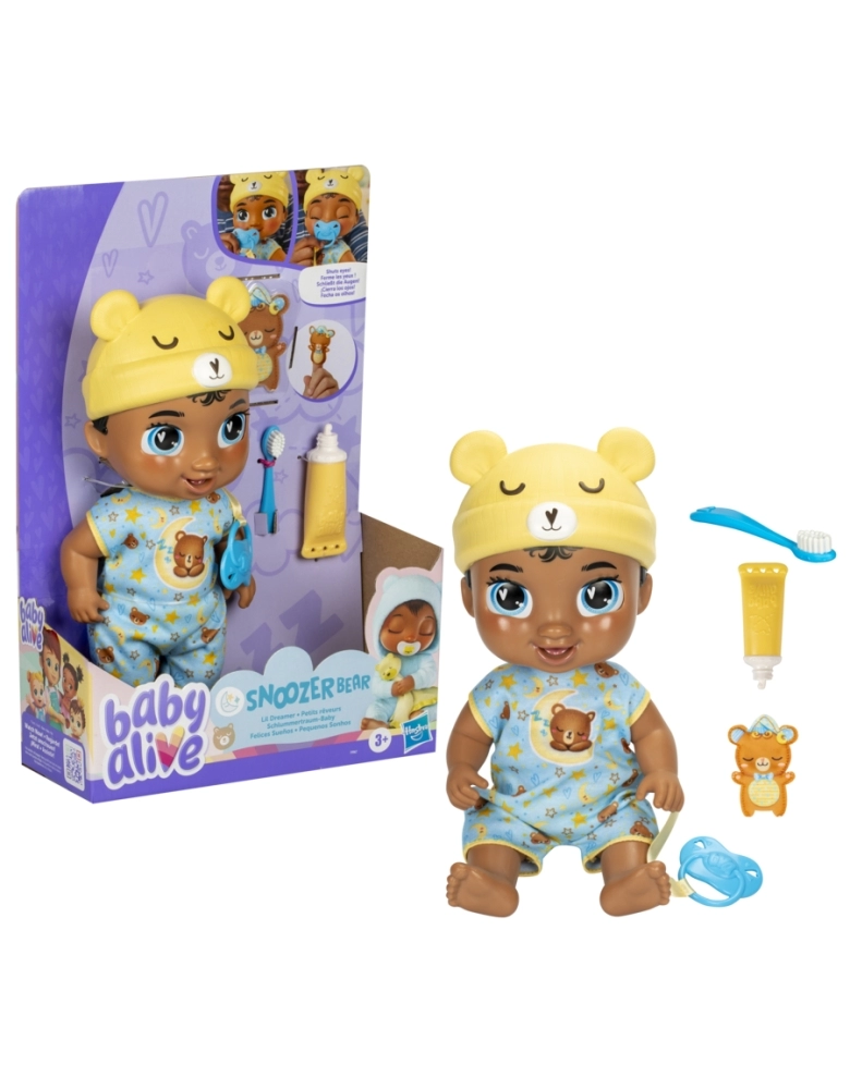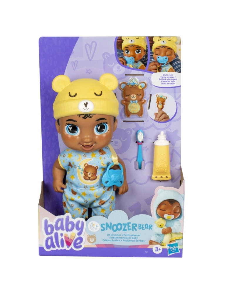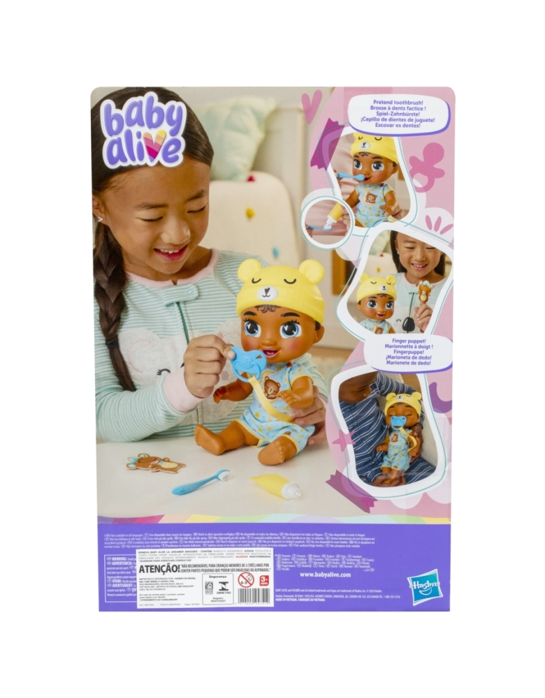 Boa noite, pequenino! As crianças podem brincar de preparar este lindo boneco de 28 cm para a hora de dormir. O boneco fecha os olhos quando recebe a chupeta. A chupeta fica presa ao pijama para não se perder. As crianças podem contar lindas histórias com a marionete de dedo em formato de urso e brincar de escovar os dentes com a escova de dente de brinquedo e a pasta de dente de mentirinha. Este kit de boneca bebê é um excelente presente para meninos e meninas. Baby Alive and all related properties are trademarks of Hasbro.