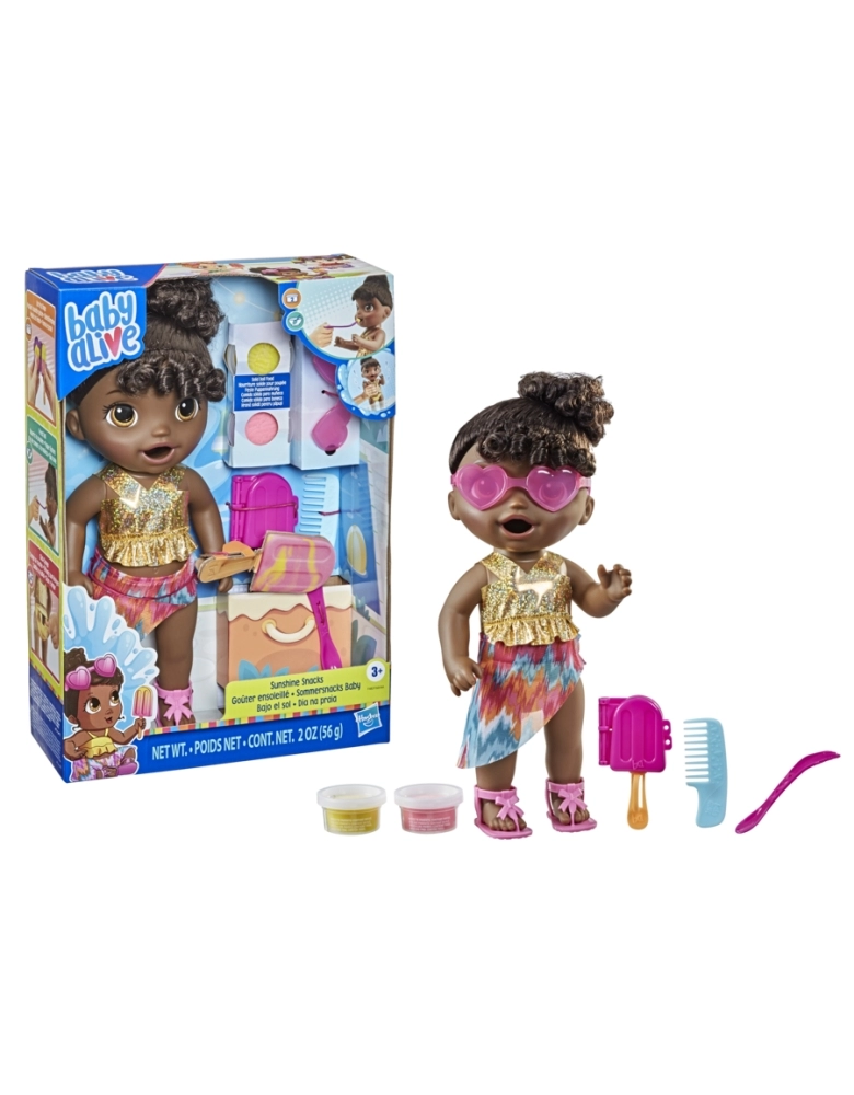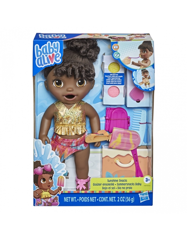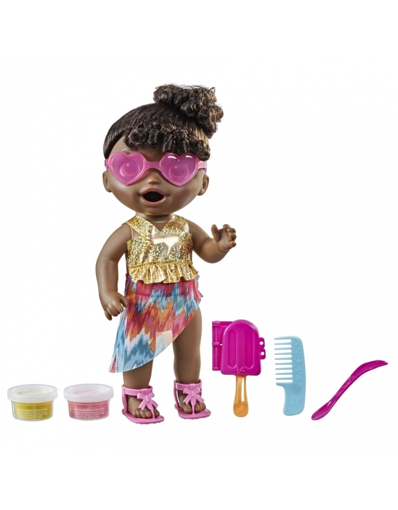 É a primeira boneca Baby Alive que pode comer e brincar dentro da água. Basta remover a comida sólida para boneca da boneca Dia na praia para prepará-la para entrar na água. As crianças podem usar a comida para boneca reutilizável incluída e o molde de picolé para criar um picolé de mentirinha. A fralda de plástico da boneca pode ser aberta para limpar a caquinha. A boneca Baby Alive Dia na praia inclui traje banho e canga, óculos de sol, sandálias, 2 potes de comida sólida para boneca, molde de picolé e palito, colher-garfo e pente. A boneca Baby Alive Dia na praia traz muitas maneiras de brincar. Excelente presente de aniversário e outras celebrações para crianças a partir de 3 anos. Baby Alive e todas as propriedades relacionadas são marcas registradas da