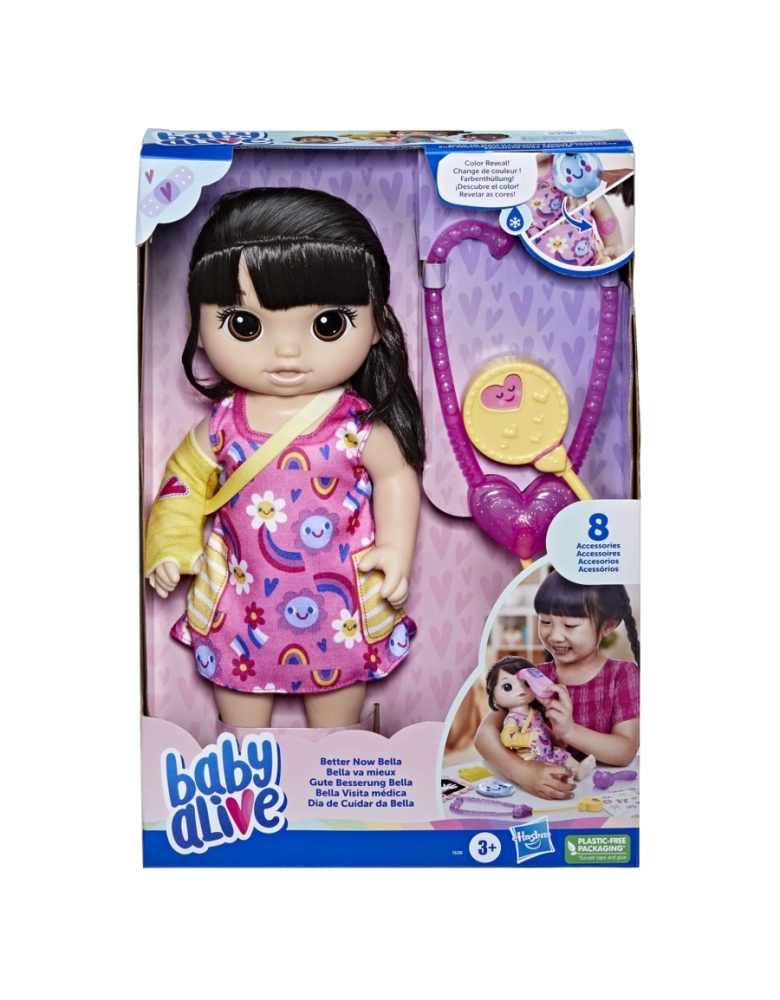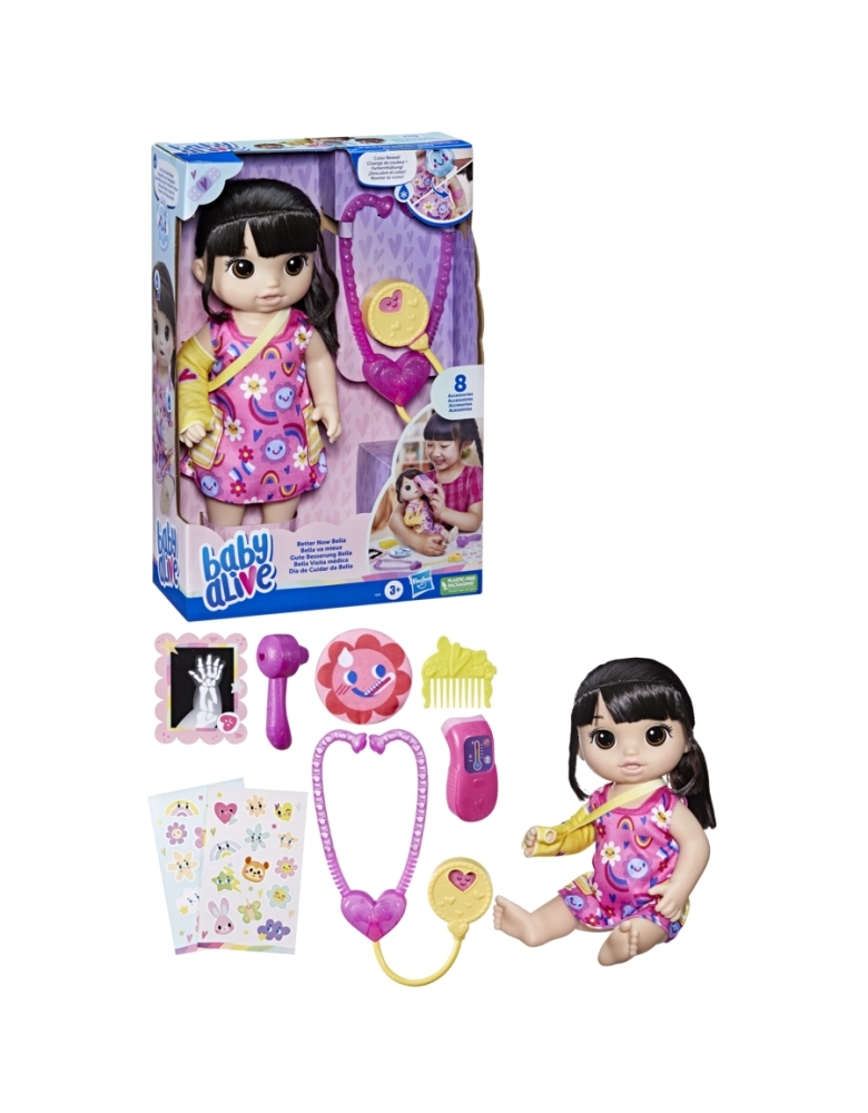 A boneca Baby Alive Better Now Bella precisa de amor e cuidados especiais! Esta boneca com tema médico vem com acessórios Baby Alive, como um gesso de braço para ela, estetoscópio, verificador de ouvido, termômetro, bolsa de gelo, chapas de raio-x, adesivos e pente. Usando água gelada e o acessório de compressa fria, revele um coração na testa de Better Now Bella! Essas bonecas de 30 cm para meninas e meninos a partir dos 3 anos vêm com um vestido removível nas cores do arco-íris. Com cachos longos e lindos, esta boneca com cabelo é muito divertida de pentear! É uma divertida boneca Baby Alive para crianças que adoram cuidar de bonecas e brinquedos de brincar de consulta médica. Elas também são ótimos presentes de aniversário e feriados para meninas e meninos. Baby Alive and all related properties are trademarks of Hasbro.