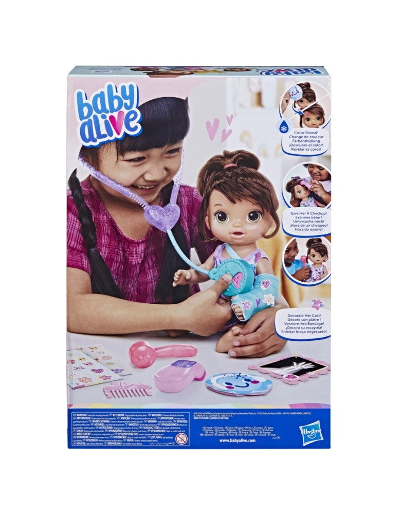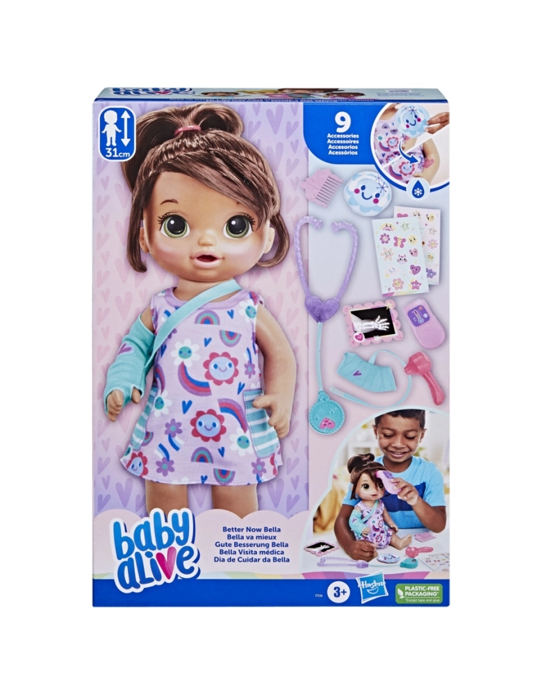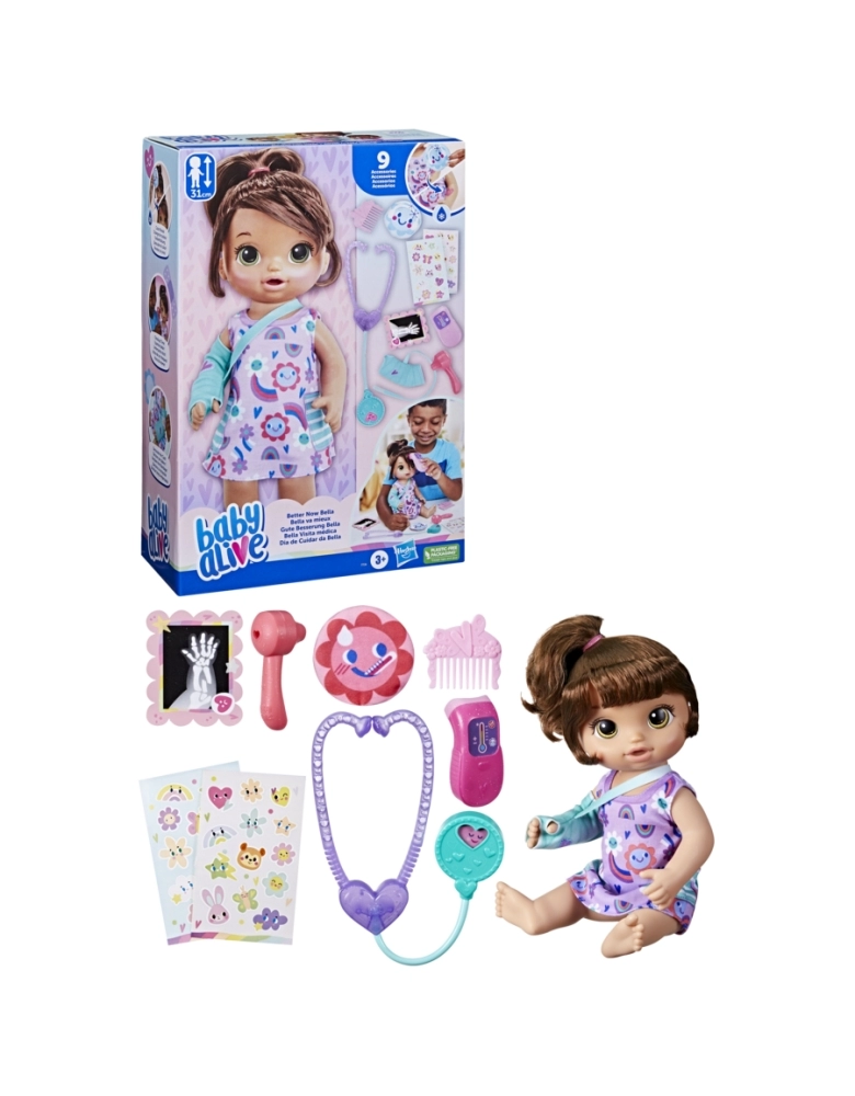 A boneca Baby Alive Better Now Bella precisa de amor e cuidados especiais! Esta boneca com tema médico vem com acessórios Baby Alive, como um gesso de braço para ela, estetoscópio, verificador de ouvido, termômetro, bolsa de gelo, chapas de raio-x, adesivos e pente. Usando água gelada e o acessório de compressa fria, revele um coração na testa de Better Now Bella! Essas bonecas de 30 cm para meninas e meninos a partir dos 3 anos vêm com um vestido removível nas cores do arco-íris. Com cachos longos e lindos, esta boneca com cabelo é muito divertida de pentear! É uma divertida boneca Baby Alive para crianças que adoram cuidar de bonecas e brinquedos de brincar de consulta médica. Elas também são ótimos presentes de aniversário e feriados para meninas e meninos. Baby Alive and all related properties are trademarks of Hasbro.
