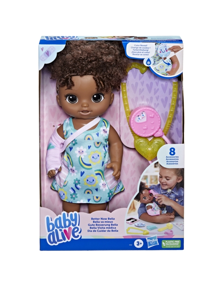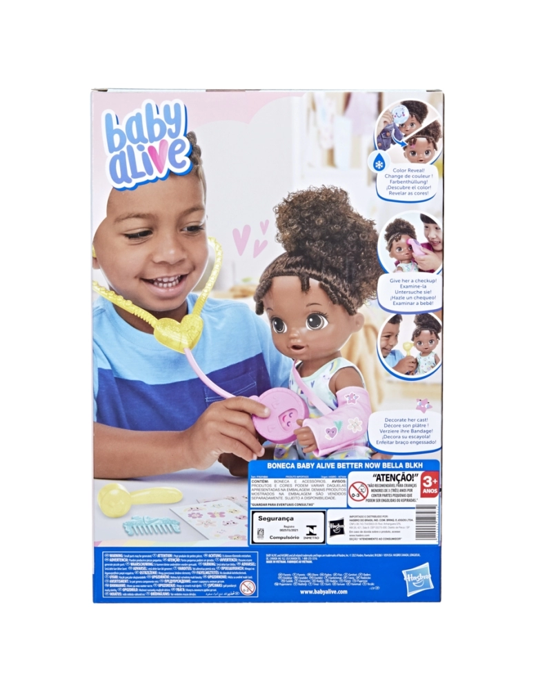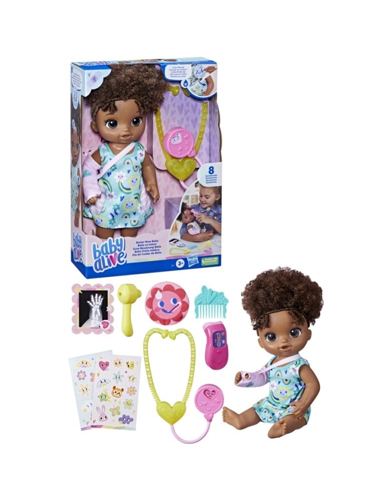 A boneca Baby Alive Better Now Bella precisa de amor e cuidados especiais! Esta boneca com tema médico vem com acessórios Baby Alive, como um gesso de braço para ela, estetoscópio, verificador de ouvido, termômetro, bolsa de gelo, chapas de raio-x, adesivos e pente. Usando água gelada e o acessório de compressa fria, revele um coração na testa de Better Now Bella! Essas bonecas de 30 cm para meninas e meninos a partir dos 3 anos vêm com um vestido removível nas cores do arco-íris. Com cachos longos e lindos, esta boneca com cabelo é muito divertida de pentear! uma divertida boneca Baby Alive para crianças que adoram cuidar de bonecas e brinquedos de brincar de consulta médica. Elas também são ótimos presentes de aniversário e feriados para meninas e meninos. Baby Alive and all related properties are trademarks of Hasbro.