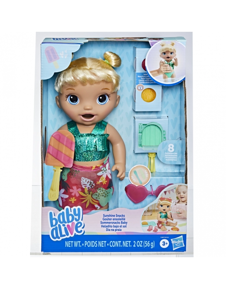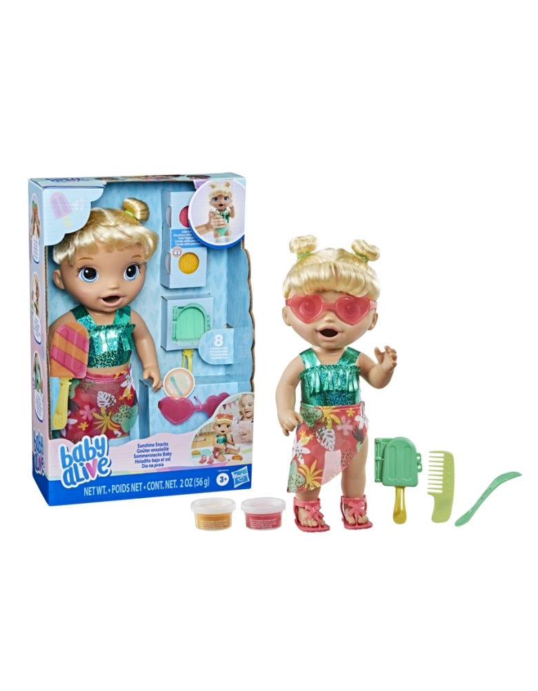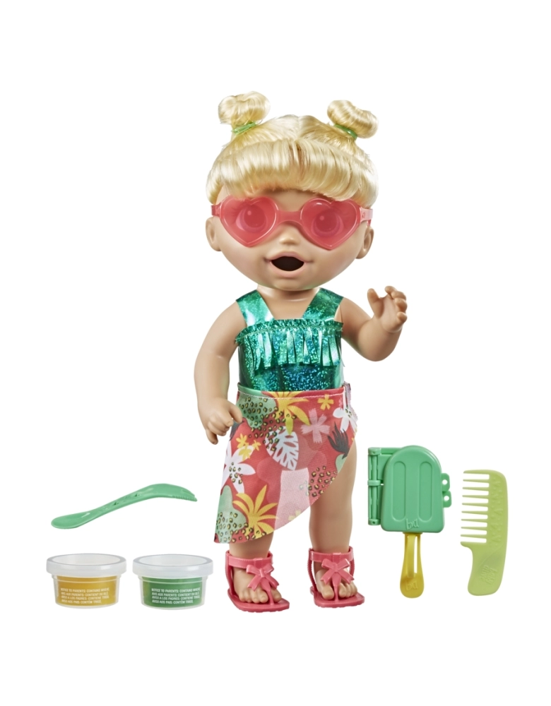 É a primeira boneca Baby Alive que pode comer e brincar dentro da água. Basta remover a comida sólida para boneca da boneca Dia na praia para prepará-la para entrar na água. As crianças podem usar a comida para boneca reutilizável incluída e o molde de picolé para criar um picolé de mentirinha. A fralda de plástico da boneca pode ser aberta para limpar a caquinha. A boneca Baby Alive Dia na praia inclui traje banho e canga, óculos de sol, sandálias, 2 potes de comida sólida para boneca, molde de picolé e palito, colher-garfo e pente. A boneca Baby Alive Dia na praia traz muitas maneiras de brincar. Excelente presente de aniversário e outras celebrações para crianças a partir de 3 anos. ; Baby Alive e todas as propriedades relacionadas são marcas registradas da Hasbro. ;