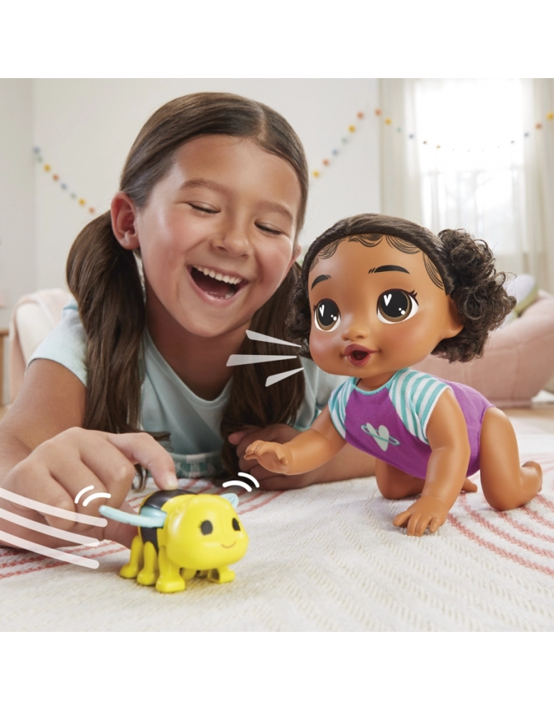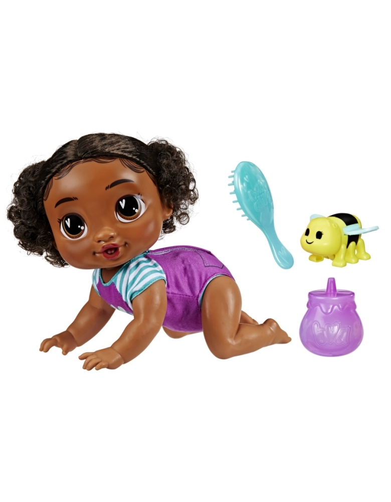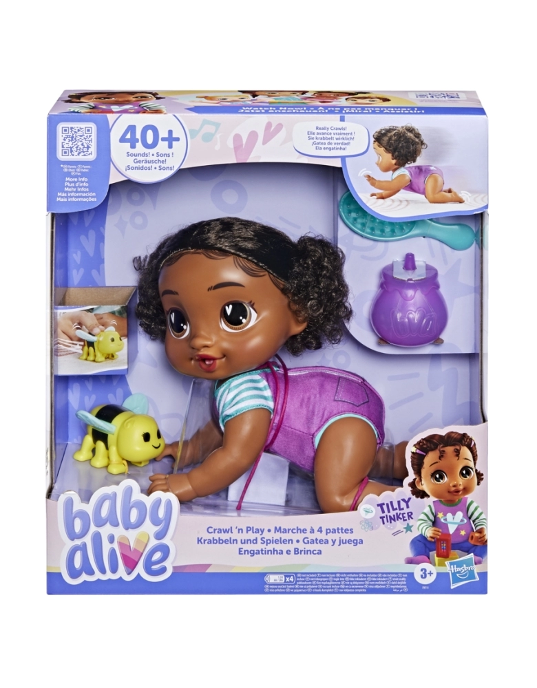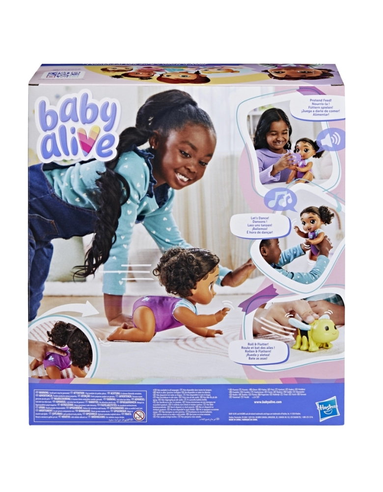 O kit Baby Alive Engatinha e Brinca traz uma boneca que engatinha de verdade. Basta apertar o botão nas suas costas para ver a boneca engatinhar e emitir sons adoráveis. Ela possui 27 cm e emite mais de 40 sons diferentes, incluindo uma música divertida. Basta encostar a mamadeira na sua boca para que a boneca emita sons de comidinha. Esta boneca vem com uma escova para pentear os seus cabelos. E sta boneca é um excelente presente para meninos e meninas a partir dos 3 anos. Baby Alive and all related properties are trademarks of Hasbro.