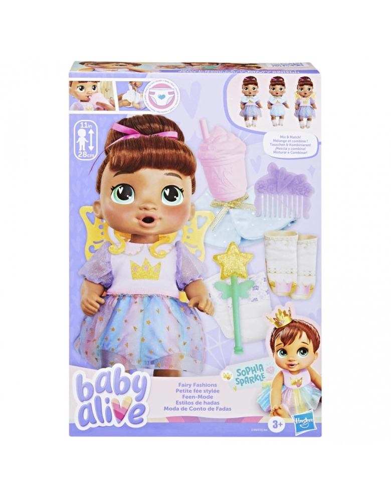 A hora de brincar ficou mais mágica com as roupas e acessórios do conjunto de bonecas Baby Alive Fairy Fashions! As crianças podem imaginar uma brincadeira fantástica com sua amiga Fairy Fashions Sophia Sparkle usando as roupas de fada bailarina. Vista-a com um adorável macacão rosa ou use a capa e a saia! E nenhuma fantasia de fada está completa sem asas - coloque o acessório de asa de fada sobre os ombros para imaginar que ela está em pleno voo! Completar o visual com meias de boneca da princesa fada e varinha de fada.