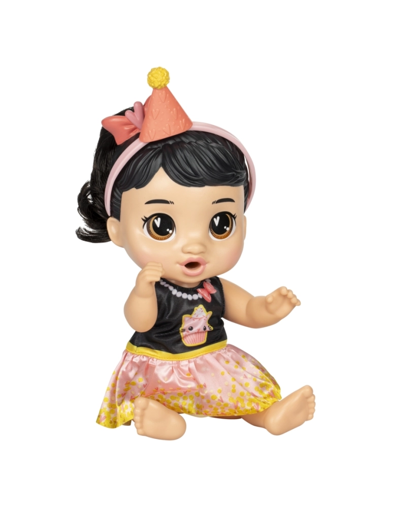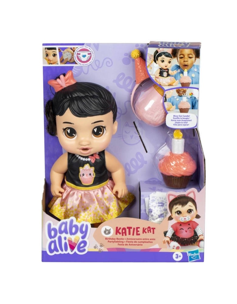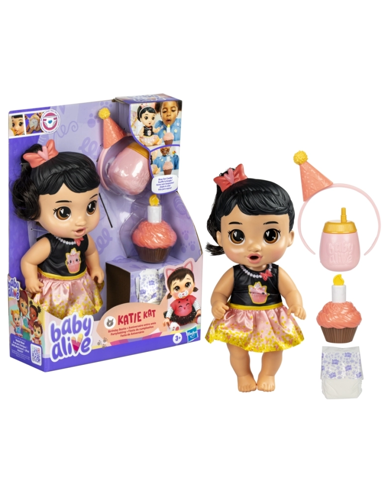 Katie Kat mal pode esperar para começar a celebração do seu aniversário! As crianças podem brincar de organizar suas próprias festas várias vezes com este kit Baby Alive. Basta colocar a faixa de cabelo chapéu de festa para começar a celebração. As crianças podem brincar de soprar a velinha com o cupcake de mentirinha! Depois de beber água da mamadeira, ela vai molhar a fralda! Excelente brinquedo infantil para crianças a partir dos 3 anos para celebrar a imaginação muitas vezes seguidas. Baby Alive and all related properties are trademarks of Hasbro.