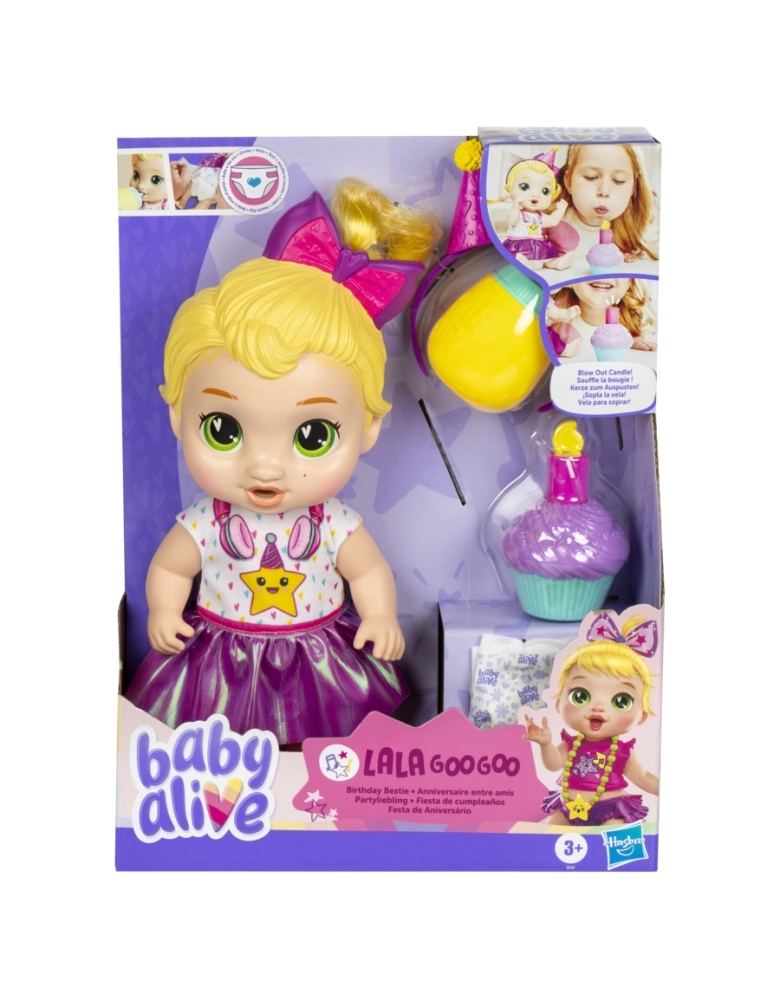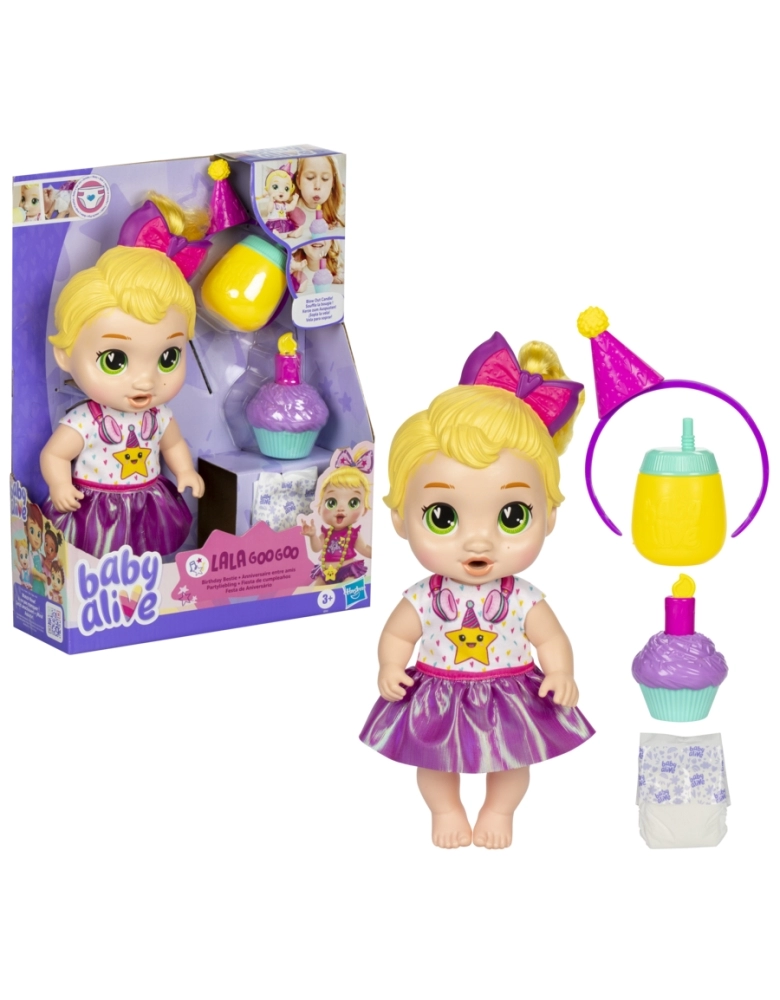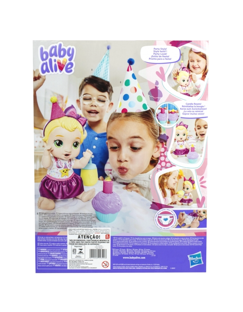 LaLa GooGoo mal pode esperar para começar a celebração do seu aniversário! As crianças podem brincar de organizar suas próprias festas várias vezes com este kit Baby Alive. Basta colocar a faixa de cabelo chapéu de festa para começar a celebração. As crianças podem brincar de soprar a velinha com o cupcake de mentirinha! Depois de beber água da mamadeira, ela vai molhar a fralda! Excelente brinquedo infantil para crianças a partir dos 3 anos para celebrar a imaginação muitas vezes seguidas. Baby Alive and all related properties are trademarks of Hasbro.