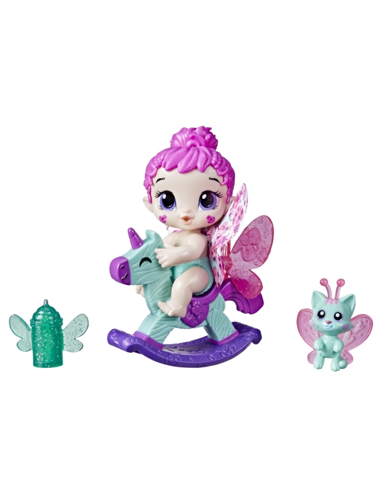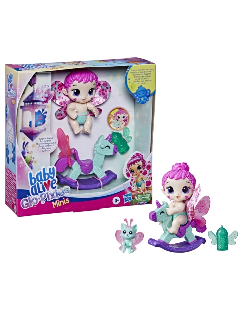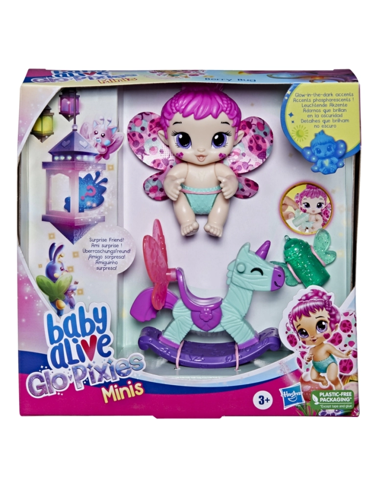 Muita diversão e surpresas com as bonecas Baby Alive Glo Pixies Minis! A boneca Berry Bug brilha no escuro e vem com 1 amiguinho surpresa. Quem será? Descobrir é muito divertido! Quando as crianças abrirem a embalagem da sua boneca Glo Pixies Minis irão descobrir qual dos animais será seu novo amiguinho. Quando no escuro, Berry Bug brilha as asas e vem com uma marquinha de fada na barriguinha (Para obter um efeito de brilho mais forte, expor a boneca à luz solar ou à luz artificial direta antes de brincar). Esta boneca de 9,5 cm possui 5 pontos de articulação e vem com acessórios de mamadeira e cavalinho de balanço. Um excelente presente para crianças a partir dos 3 anos.
