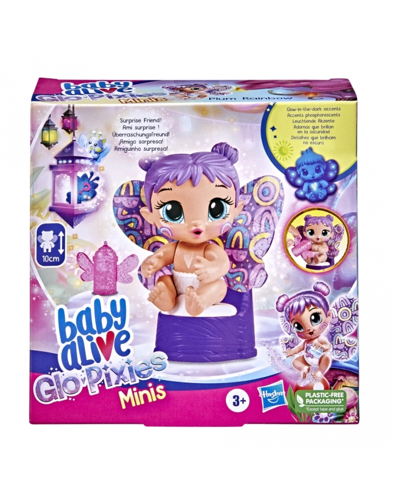 Muita diversão e surpresas com as bonecas Baby Alive GloPixies Minis! A boneca Plum Rainbow brilha no escuro e vem com 1 amiguinho surpresa. Quem será? Descobrir é muito divertido! Quando as crianças abrirem a embalagem da sua boneca GloPixies Minis irão descobrir qual dos animais será seu novo amiguinho. Quando no escuro, Plum Rainbow brilha as asas e vem com uma marquinha de fada na barriguinha.