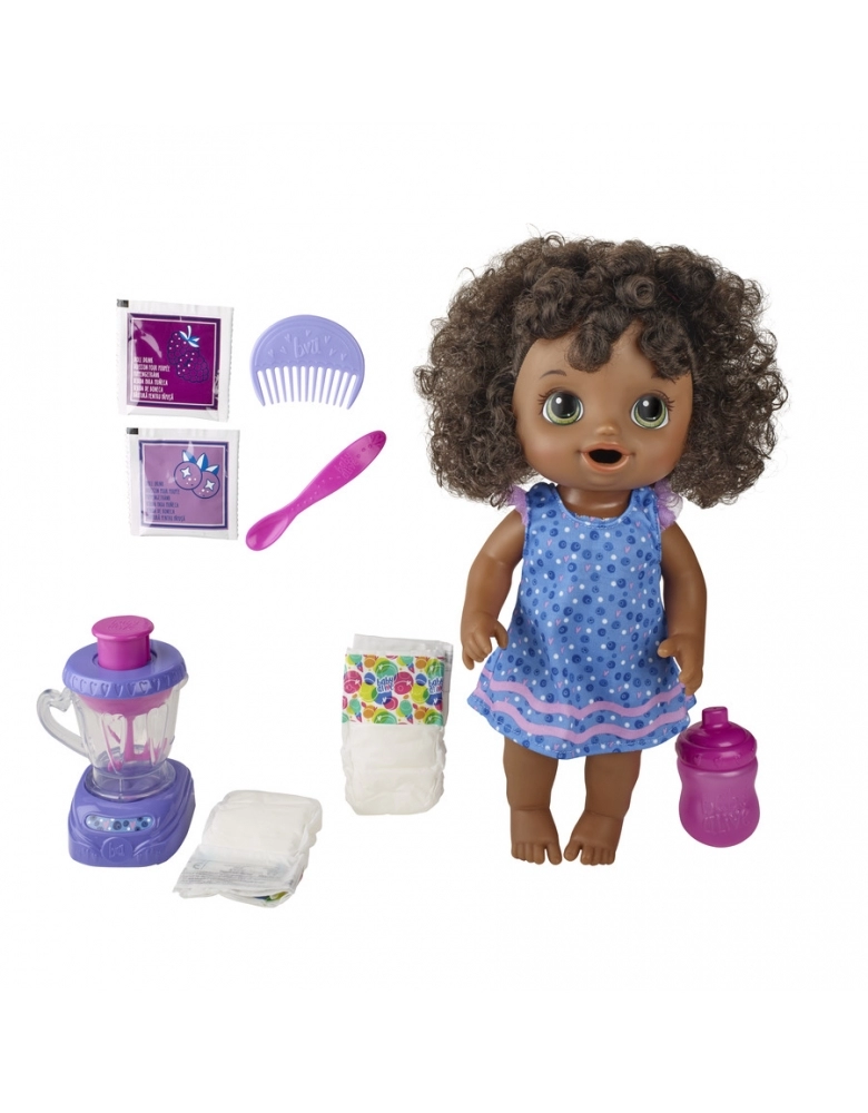É muito divertido fazer papinhas para a bebê Misturinha com o liquidificador que funciona de verdade. Basta abrir 1 dos 2 sachês incluídos de comida em pó para boneca (outros sachês vendidos separadamente), colocar no liquidificador com 3 colhes de sopa (15 ml) de água e apertar o botão para fazer a comida da bebê. A boneca vem com uma colher e um pente. A boneca bebe água, faz xixi e faz caquinha. Depois de comer, a boneca pode beber água da mamadeira. Ótimo presente para meninos e meninas acim