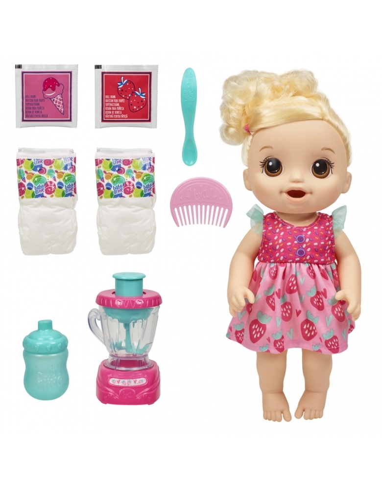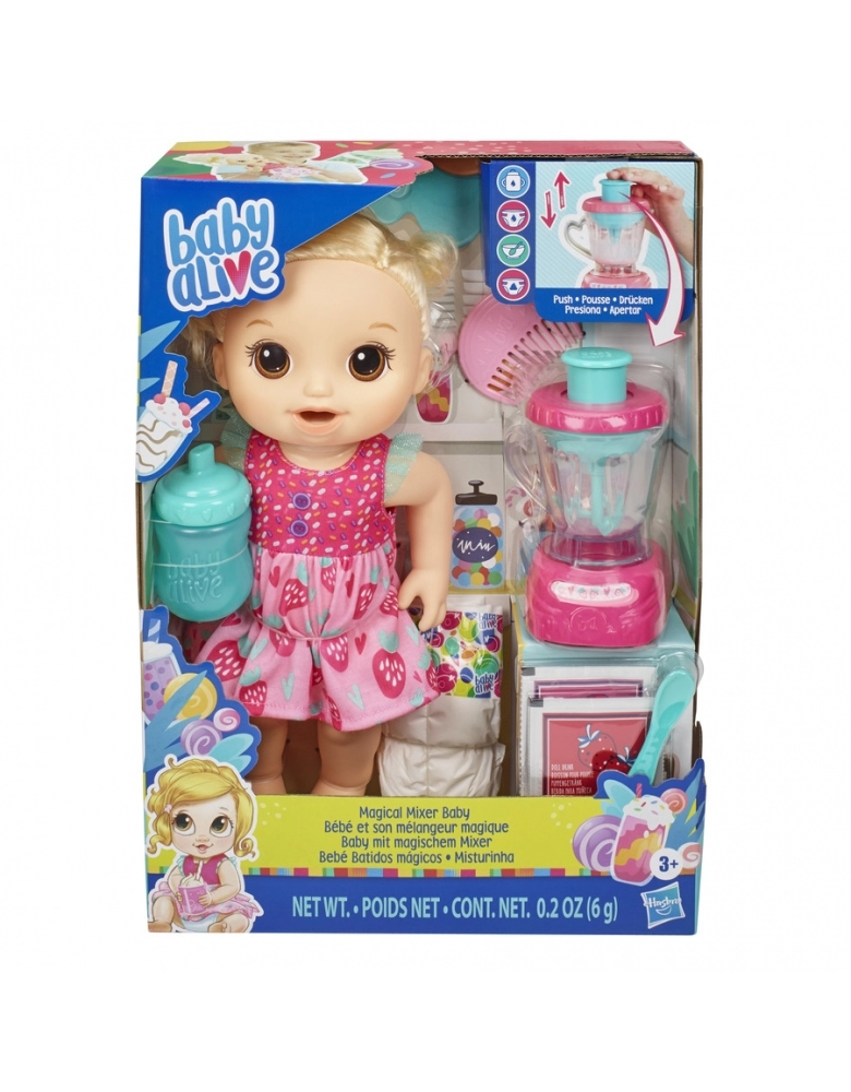 É muito divertido fazer papinhas para a bebê Misturinha com o liquidificador que funciona de verdade. Basta abrir 1 dos 2 sachês incluídos de comida em pó para boneca (outros sachês vendidos separadamente), colocar no liquidificador com 3 colhes de sopa (15 ml) de água e apertar o botão para fazer a comida da bebê. A boneca vem com uma colher e um pente. A boneca bebe água, faz xixi e faz caquinha. Depois de comer, a boneca pode beber água da mamadeira. Ótimo presente para meninos e meninas acim