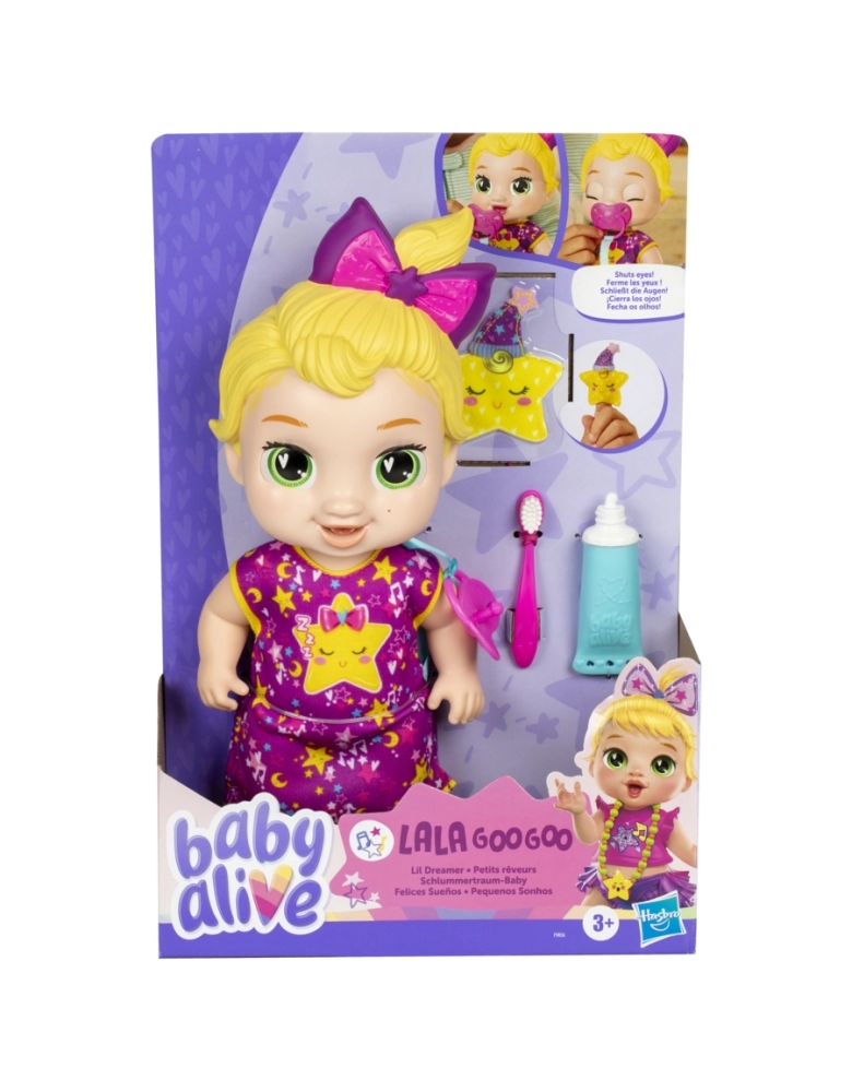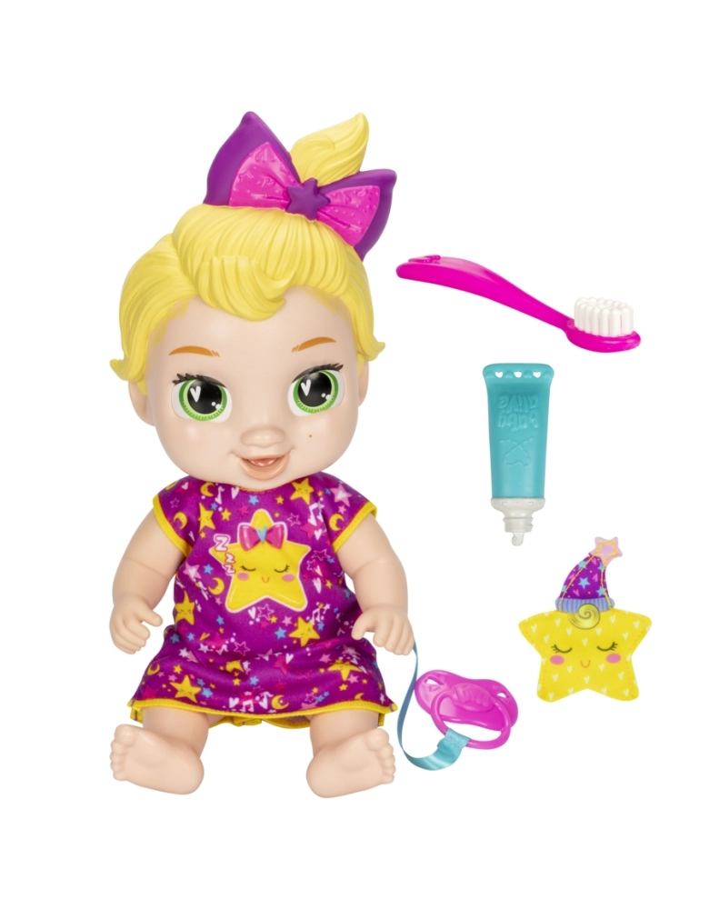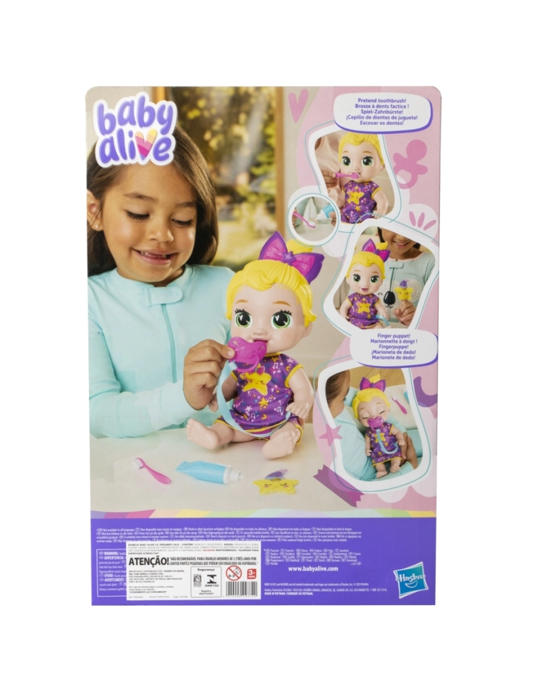 Boa noite, pequenina! As crianças podem brincar de preparar esta linda boneca de 28 cm para a hora de dormir. A boneca fecha os olhos quando recebe a chupeta. A chupeta fica presa ao pijama para não se perder. As crianças podem contar lindas histórias com a marionete de dedo em formato de estrela e brincar de escovar os dentes com a escova de dente de brinquedo e a pasta de dente de mentirinha. Este kit de boneca bebê é um excelente presente para meninos e meninas. Baby Alive and all related properties are trademarks of Hasbro.