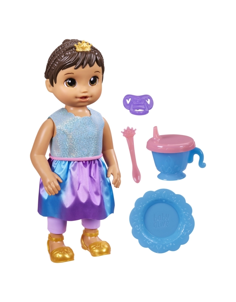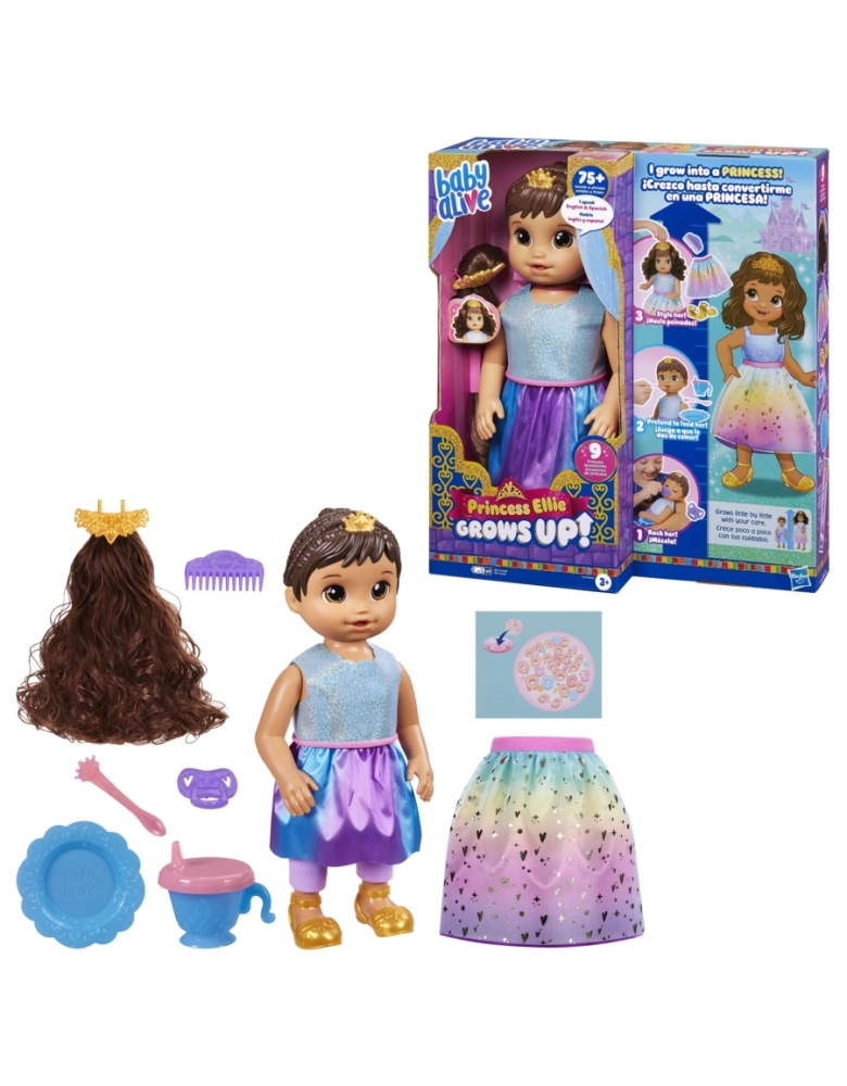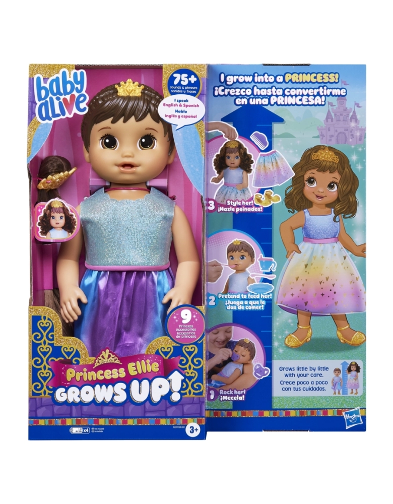 As crianças irão se divertir cuidando da boneca Baby Alive Princess Ellie Crows Up até ela se tornar uma princesa! Esta boneca de 45 cm vem com mais de 75 sons e frases. Esta boneca Baby Alive tem 37 cm inicialmente e cresce lentamente quando as crianças usam seus acessórios como chupeta, copo com canudinho e tigela com colher. A boneca irá crescer lentamente com as brincadeiras e ao se alimentar. A boneca irá dizer uma frase ao se transformar em uma princesa. As crianças a partir dos 3 anos podem colocar a tiara na cabeça da boneca e criar penteados. A transformação estará completa com a linda saia brilhante de princesa. A boneca pode alternar entre os modos Bebê (37 cm) e Princesa (45 cm) mais rápido ao pressionar o botão de crescimento nas costas. Presente incrível de aniversário ou outras celebrações para meninos e meninas.