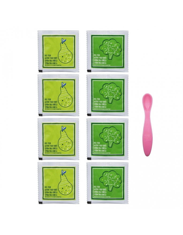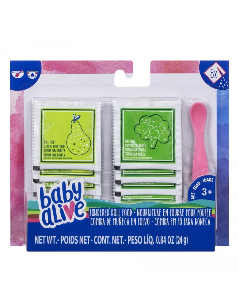 Oito pacotes de comidinha de boneca BABY ALIVE ajudam a manter o estômago – e a fraldinha– da sua boneca cheios! Para uso exclusivo com as bonecas BABY ALIVE (vendidas separadamente). Inclui 8 pacotes de comidinha de boneca e colher.