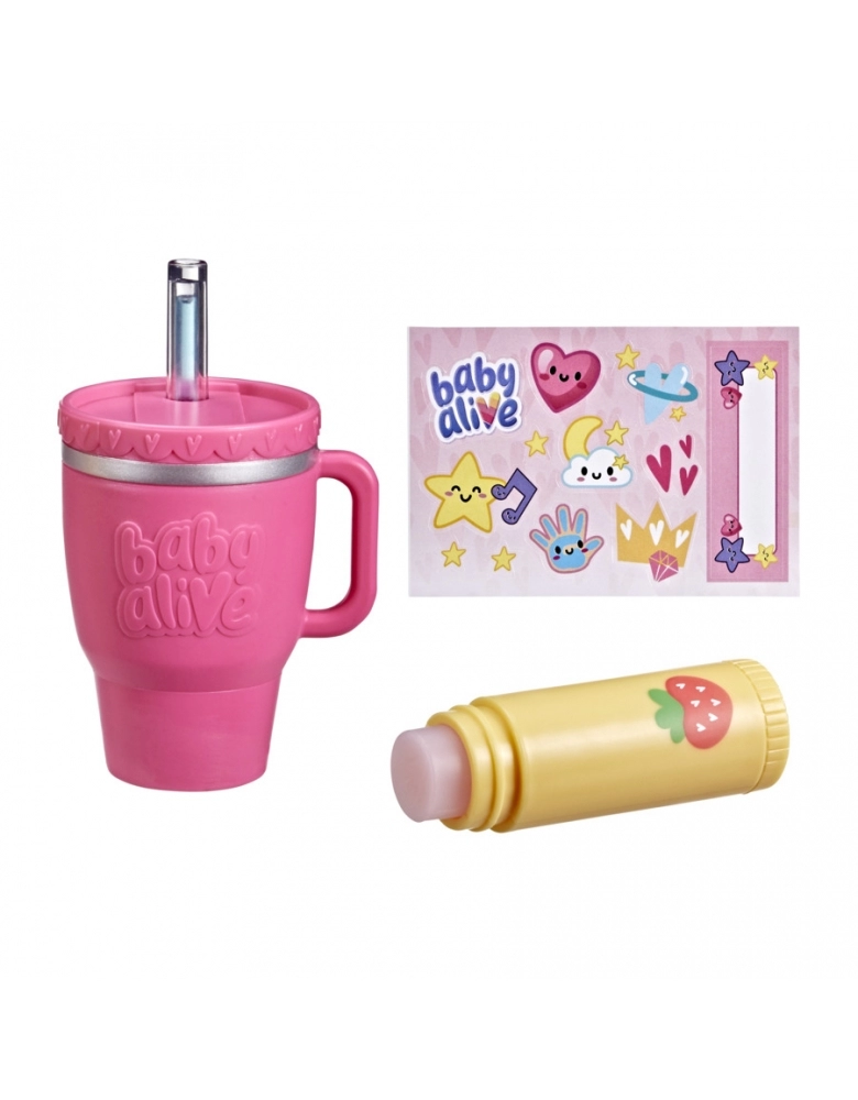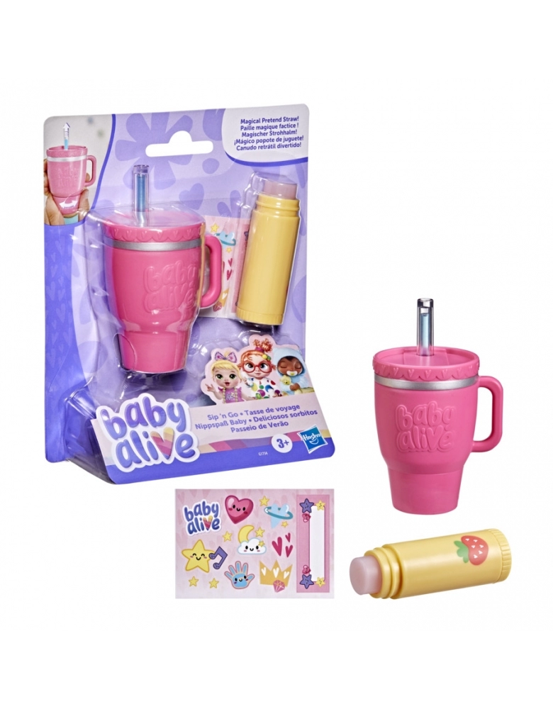 Dê mais estilo às suas bonecas Baby Alive com o conjunto de acessórios Sip 'n Go! O conjunto vem com um copo de viagem para que as crianças possam usar para brincar de dar de beber às bonecas, assim como fariam com as mamadeiras Baby Alive! O copo tem um canudo mágico transparente que fica azul ao girar o fundo do copo. Assim, as crianças podem imaginar que estão dando água para a boneca bebê, mas sem molhar nada! Decore o copo de viagem com a folha de adesivos inclusa. O conjunto vem com um balm labial que as crianças podem usar para passar nas suas bonecas Baby Alive.