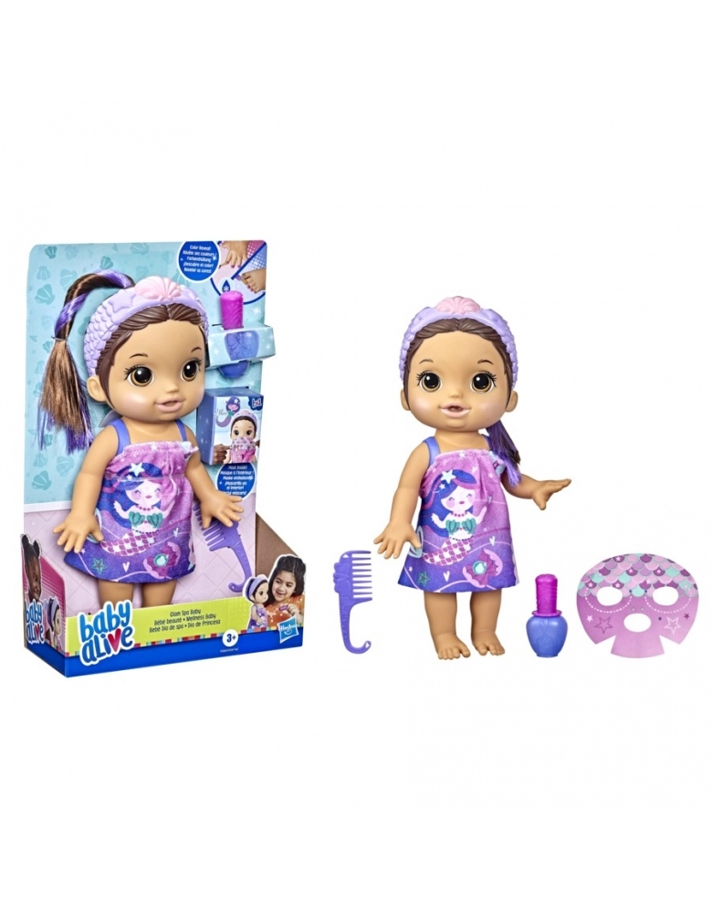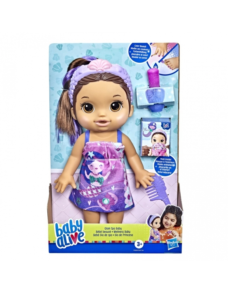 É muito divertido cuidar da bebê com acessórios de beleza! As crianças irão se divertir revelando a cor do esmalte das mãos e pés da boneca Baby Alive Dia de Princesa. A máscara revela a maquiagem dos olhos no rosto da boneca. Meninas e meninos a partir dos 3 anos podem brincar de pintar as unhas da boneca com o pincel e revelar uma divertida cor em suas mãos e pés. É só encher o potinho de esmalte de mentirinha com água gelada! A boneca vem com acessórios de beleza como toalha, máscara de boneca, pote de esmalte de mentirinha e um pente. Vem embalada em embalagem reciclável de papel que não contém plástico, exceto pela fita adesiva e cola. A boneca Baby Alive Dia de Princesa é um excelente presente de aniversário, Natal ou outras celebrações.