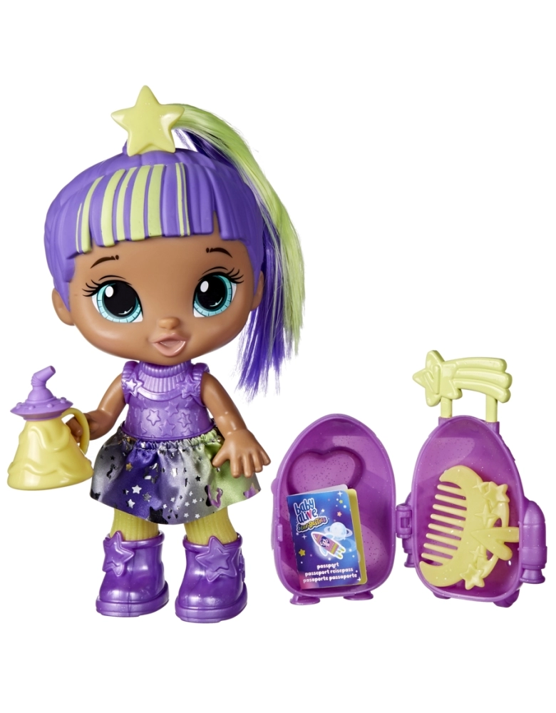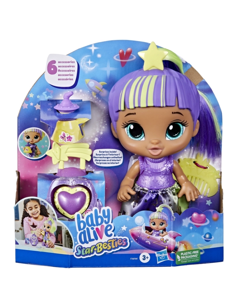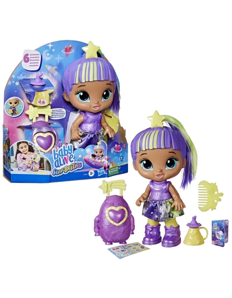 As melhores amigas de toda a galáxia! A boneca Baby Alive Star Besties possui tema espacial brilhante para muita diversão intergaláctica. Com decoração e acessórios inspirados no espaço, esta boneca Baby Alive Star Besties está pronta para aventuras espaciais! Inclui acessórios Baby Alive como saia removível, mala espacial, passaporte planetário, suco, pente e adesivos. Esta boneca Baby Alive é um excelente presente para meninas e meninos a partir dos 3 anos e inclui adesivos para enfeitar sua mala que pode armazenar os acessórios incluídos. Outras bonecas Baby Alive Star Besties disponíveis (vendidas separadamente e sujeitas à disponibilidade).