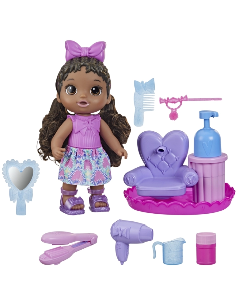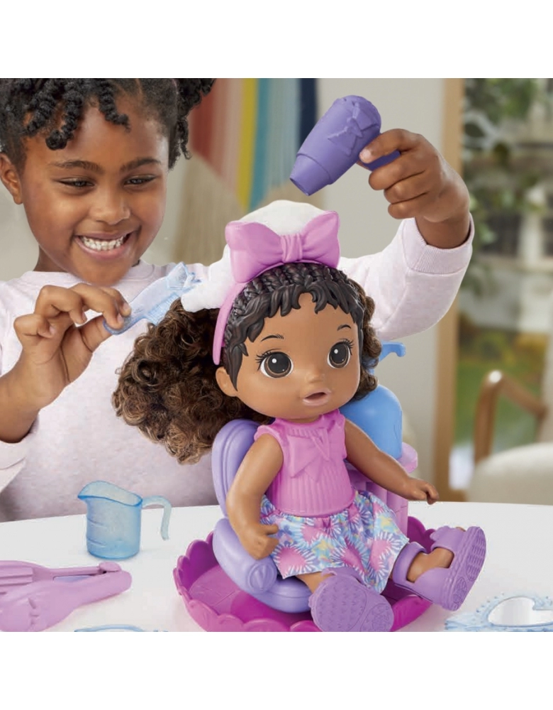 Lindos cabelos borbulhantes. As crianças podem colocar a boneca na cadeira de salão de beleza e criar penteados com as bolhas de sabão. Esta boneca Baby Alive de 30 cm vem com uma cadeira de salão e acessórios como pente, ferramenta de beleza, secador de cabelo, espelho e presilha. As crianças a partir dos 3 anos podem misturar água e sabão no copinho, colocar na cadeira e apertar o shampoo para ver as bolhas saírem pela cabeça da boneca. As crianças podem usar os acessórios para moldar as bolhas de sabão e usar o espelho para admirar o resultado final. As crianças podem brincar várias vezes. Basta usar o shampoo de bebê ou solução de bolhas de sabão para brincar novamente. Excelente presente de aniversário ou outras celebrações para meninos e meninas.