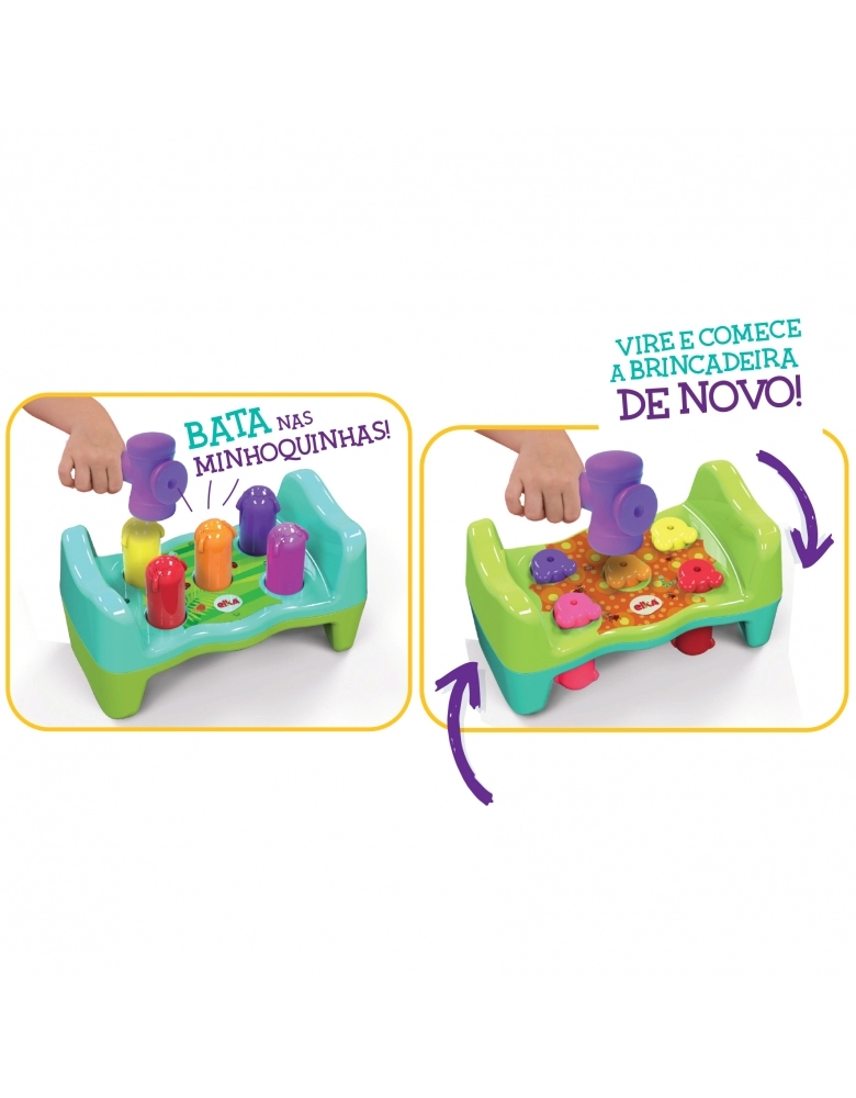 Base com minhoquinhas que saem da terra e martelo fofinho. Bata nas minhocas e elas descem, vire e comece a brincadeira de novo! Material resistente, martelo fofinho, cores e formas que estimulam a criança. Desenvolve o raciocinio, coordenação motora e estimula a criatividade