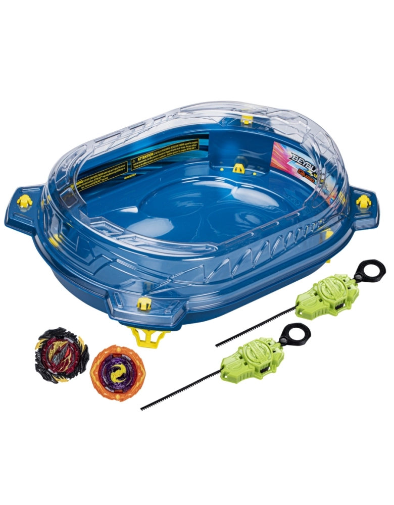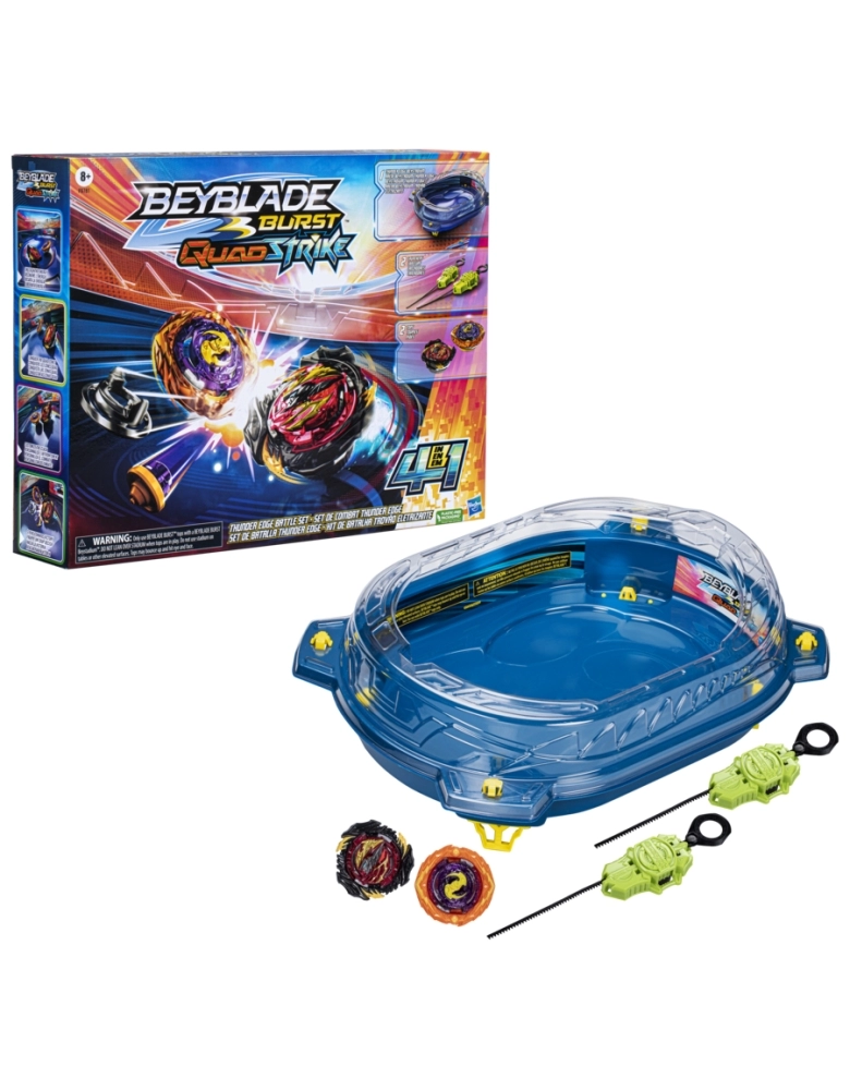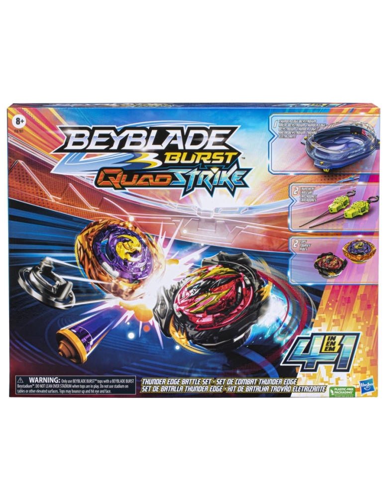 O nível da batalha subiu! Com lançadores e piões QuadStrike com pontas blindadas, meninos e meninas a partir dos 8 anos vão se divertir com batalhas épicas e golpes ferozes. O pião pode ser configurado de 4 maneiras para se adaptar a estratégias diferentes. 4 modos de batalha, 4 formas de vencer. Basta analisar o oponente e escolher a modificação para garantir a vitória. Contém arena QuadStrike Thunder Edge Beystadium, 2 lançadores e 2 piões, um kit completo de batalha. Escanear os códigos para competir no app Beyblade Burst! Inclui 2 piões de giro à direita: Lightning Pandora Endless P8 G16 QS01 TB15-Q S10 e Divine Evo Belfyre B8 G02 QD09 TD18-Q A09. Pode-se personalizar nos modos Core e Apex, e modos Core+ e Apex+ para mudar o tipo. A arena Thunder Edge Beystadium possui 4 zonas Quad, incluindo a zona de queda imprevisível. Hasbro and all related terms are trademarks of Hasbro, Inc.