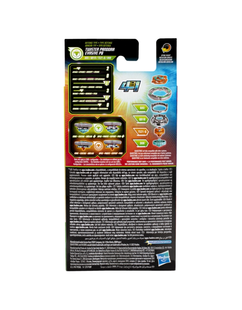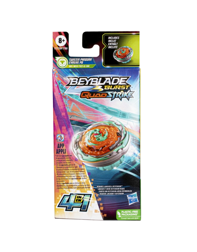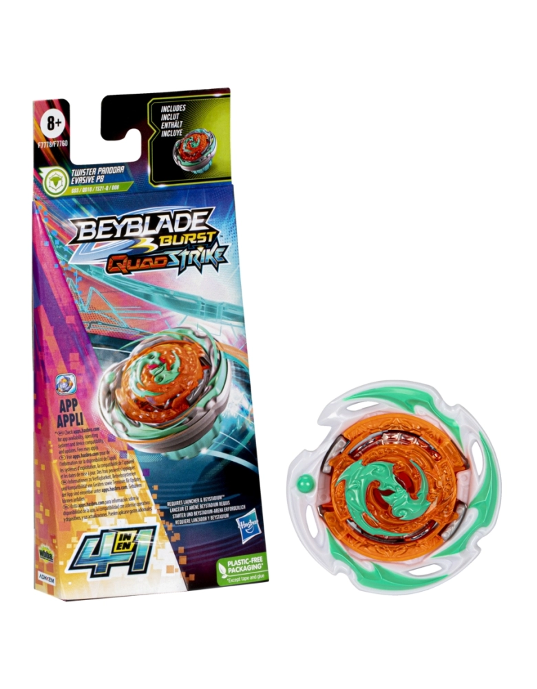 A batalha ganha outro nível com cada pião Beyblade Burst QuadStrike! Com os piões Beyblade para crianças a partir dos 8 anos, as crianças podem se divertir em batalhas ferozes e enfrentar competidores em desafios intensos. Os piões QuadStrike possuem pontas blindadas para intensificar a ação das batalhas. O pião pode ser configurado de 4 maneiras com 4 estratégias diferentes, 4 modos de batalha e 4 modos de vencer! Treinar para se tornar campeão da arena com o pião Twister Pandora Evasive P8 G03 QD10 TS21-Q D08. Customizar o pião nos modos Core e Apex para o tipo resitência ou modos Core+ e Apex+ para o tipo defesa Os jogadores devem buscar a melhor maneira de configurar o pião para a batalha na arena Beystadium QuadStrike (arena e lançador vendidos separadamente, sujeitos à disponibilidade). Basta ler o código nos piões para iniciar uma batalha virtual no aplicativo Beyblade Burst! Hasbro and all related terms are trademarks of Hasbro, Inc.