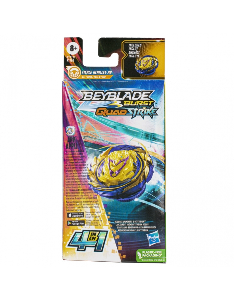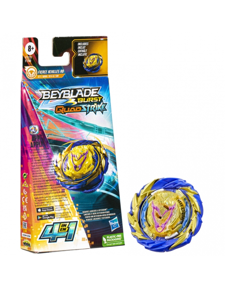 O nível da batalha subiu! Com lançadores e piões QuadStrike com pontas blindadas, meninos e meninas a partir dos 8 anos vão se divertir com batalhas épicas e golpes ferozes. O pião pode ser configurado de 4 maneiras para se adaptar a estratégias diferentes. 4 modos de batalha, 4 formas de vencer. Basta analisar o oponente e escolher a modificação para garantir a vitória. É hora de treinar para se tornar o campeão da arena com o pião de giro à esquerda Beyblade Burst QuadStrike Fierce Achilles A8 G11 QD08 TB14-Q S08. O jogador personaliza o pião para os modos Core e Apex para o tipo equilíbrio ou modos Core+ e Apex+ para o tipo resistência, e tenta ativar o poder da tecnologia avançada QuadStrike na arena QuadStrike Beystadium (a arena Beystadium e lnçadores são vendidos separadamente, sujeitos à disponibilidade). Escanear o código nos piões QuadStrike para liberar o pião em uma batalha virtual no aplicativo Beyblade Burst! Hasbro and all related terms are trademarks of Hasbro, Inc.