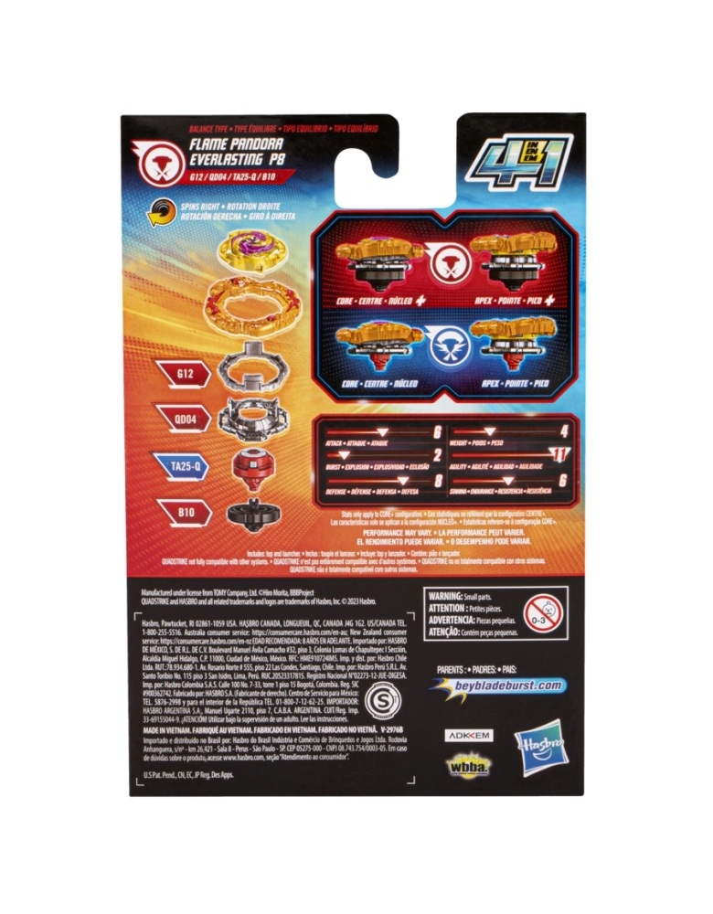 Beyblade Burst QuadStrike Flame Pandora Everlasting P8 Kit Inicial lança você para o próximo estágio de Beyblade para meninos e meninas de 8 anos. Os piões QuadStrike são aprimorados com pontas blindadas, projetadas para intensificar o desempenho na batalha, desencadear ataques mais ferozes e derrubar oponentes com confrontos mais intensos. O pião pode ser configurado de 4 maneiras com 4 estratégias diferentes, 4 modos de batalha e 4 modos de vencer! PERSONALIZAR O COMBATE: Inclui pião de giro à direita Beyblade Burst QuadStrike Flame Pandora Everlasting P8 G12 QD04 TA25-Q B10 e lançador. Customizar o pião nos modos Core e Apex para o tipo ataque ou modos Core+ e Apex+ para o tipo equilíbrio Os jogadores devem buscar a melhor maneira de configurar o pião para a batalha na arena Beystadium QuadStrike (arena vendida separadamente, sujeita à disponibilidade). Basta escanear o código na arena Beystadium QuadStrike para desbloquear o pião no aplicativo Beyblade Burst. Hasbro and all related terms are trademarks of Hasbro, Inc.