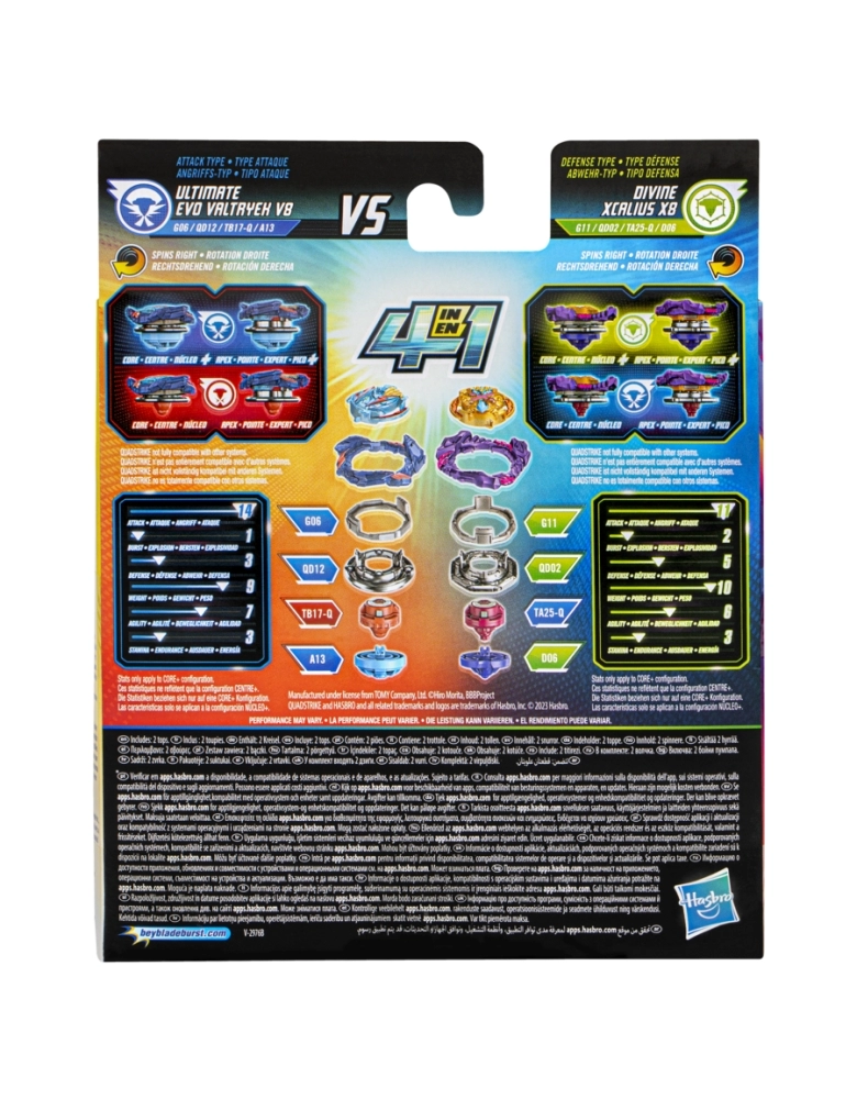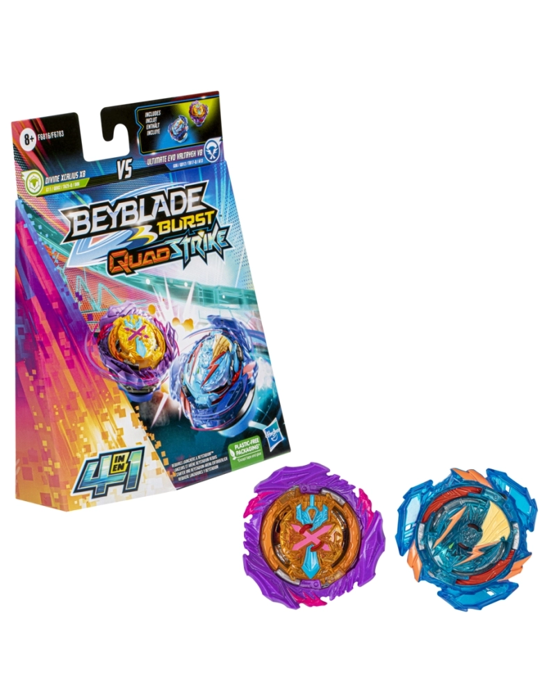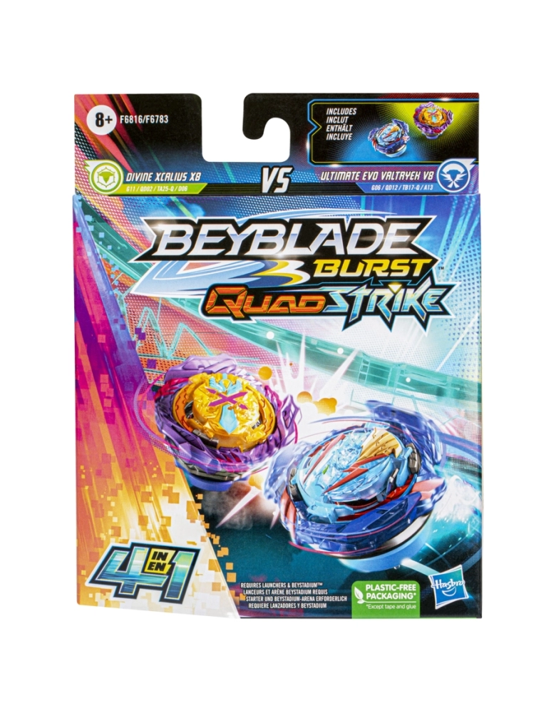 Evolução na batalha com os piões Beyblade Burst QuadStrike Ultimate Evo Valtryek V8 e Divine Xcalius X8! Com os piões Beyblade para meninos e meninas de 8 anos, as crianças podem se divertir em batalhas ferozes e enfrentar competidores em desafios intensos. Os piões QuadStrike possuem pontas blindadas para intensificar a ação das batalhas. O pião pode ser configurado de 4 maneiras com 4 estratégias diferentes, 4 modos de batalha e 4 modos de vencer! Emocionantes batalhas na arena com os piões Ultimate Evo Valtryek V8 G06 QD12 TB17-Q A13 (tipo ataque e equilíbrio) e Divine Xcalius X8 G11 QD02 TA25-Q D06 (tipo defesa e ataque). Personalizar nos modos Core ou Apex, e então Core+ e Apex+ para mudar o tipo do pião. Os jogadores devem buscar a melhor maneira de configurar o pião para a batalha na arena Beystadium QuadStrike (arena e lançador vendidos separadamente, sujeitos à disponibilidade). Basta escanear o código na arena Beystadium QuadStrike para desbloquear o pião no aplicativo Beyblade Burst. Hasbro and all related terms are trademarks of Hasbro, Inc.