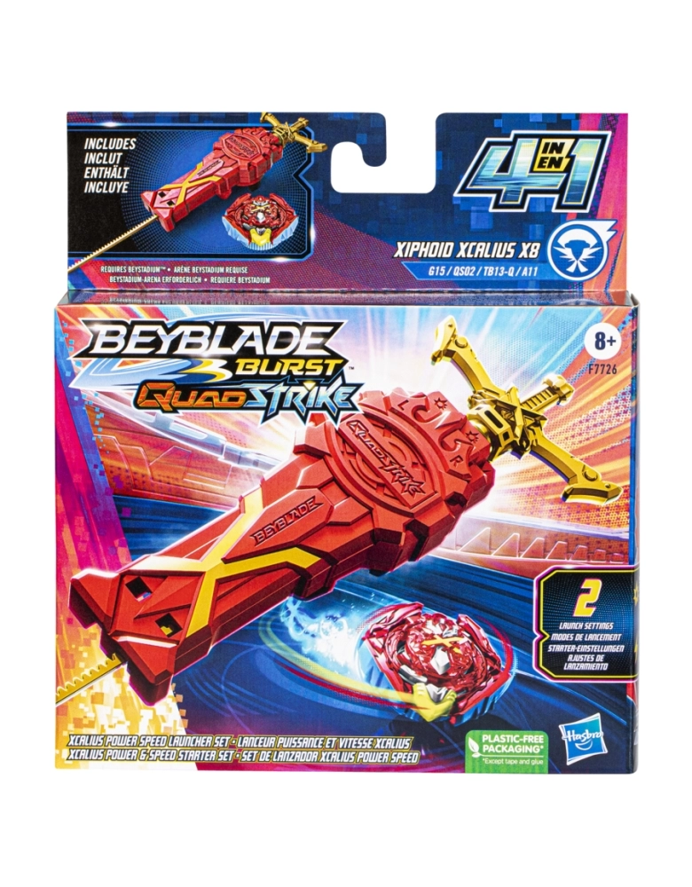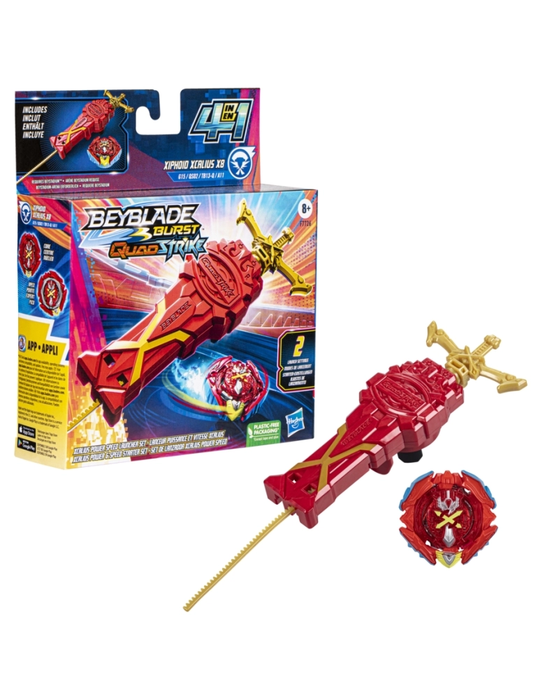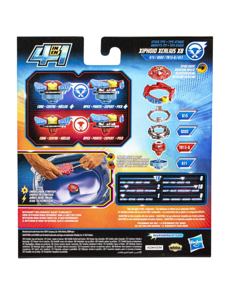 O nível da batalha subiu! Com lançadores e piões QuadStrike com pontas blindadas, meninos e meninas a partir dos 8 anos vão travar batalhas épicas, dar golpes ferozes e derrotar os oponentes. O pião pode ser configurado de 4 maneiras para se adaptar a estratégias diferentes. 4 modos de batalha, 4 formas de vencer. Basta analisar o oponente e escolher a modificação para garantir a vitória. O Kit Xcalius lançador potência e velocidade possui 1 lançador Xcalius e 1 pião de giro à direita: Xiphoid Xcalius X8 G15 QS02 TB13-Q A11. O lançador Xcalius vem com 2 modos: potência e velocidade. O modo potência envia o pião turbinado para a batalha, enquanto que o modo velocidade intensifica a rotação. Personalizar o pião para os modos Core e Apex para o tipo equilíbrio ou para os modos Core + e Apex + para o tipo ataque. Os jogadores devem buscar a melhor maneira de configurar o pião para a batalha e controlar o poder da avançada tecnologia QuadStrike na arena Beystadium QuadStrike (arena vendida separadamente, sujeita à disponibilidade). Hasbro and all related terms are trademarks of Hasbro, Inc.