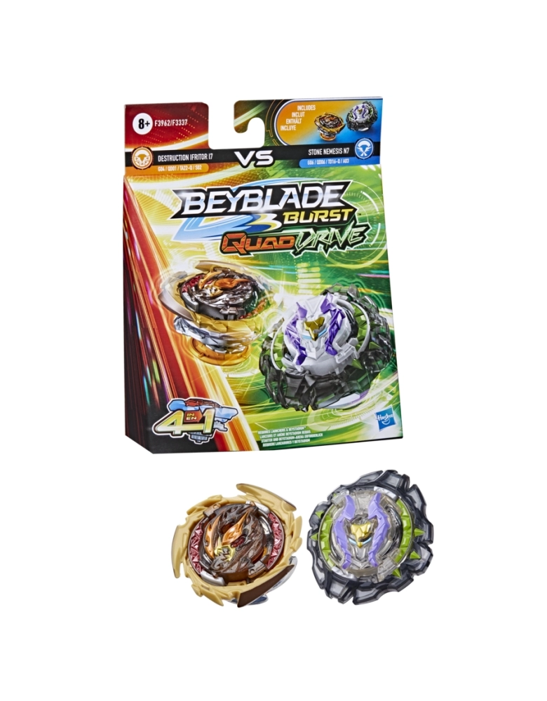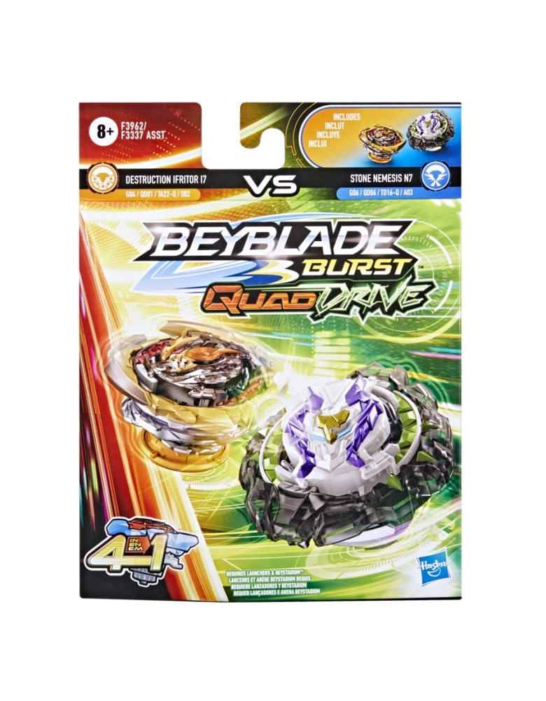 Os piões QuadDrive podem ser configurados de 4 maneiras e podem ser personalizados como nunca antes para ganhar maiores vantagens na batalha. São 4 estratégias, 4 modos de batalhas, 4 maneiras de vencer. É hora de treinar para se tornar o campeão da arena com os piões Destruction Ifritor I7 G04 QD01 TA22-Q S02 e Stone Nemesis N7 G06 QD06 TD16-Q A03. O jogador personaliza o pião para os modos Core e Apex ou para os modos Core + e Apex +, e tenta ativar o poder da tecnologia avançada QuadDrive na arena QuadDrive Beystadium (a arena Beystadium é vendida separadamente). Escanear o código nos piões QuadDrive para liberar o pião em uma batalha virtual no aplicativo Beyblade Burst! Batalhas radicais com as arenas Beyblade Burst Beystadiumlançadores e piões numa grande jornada Beyblade.