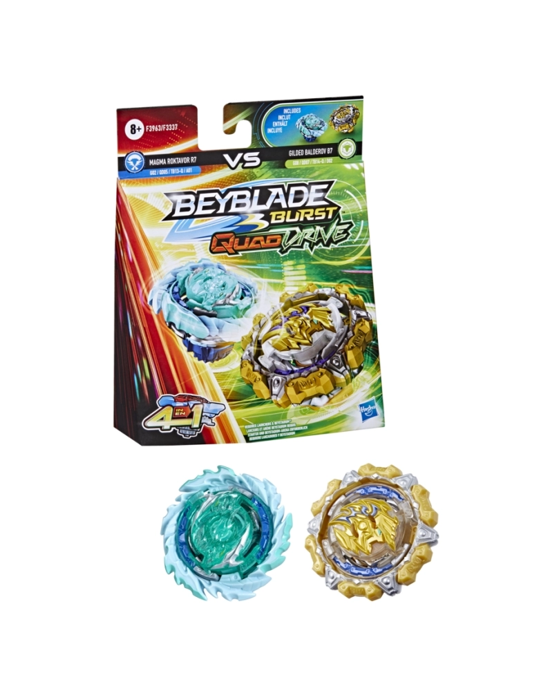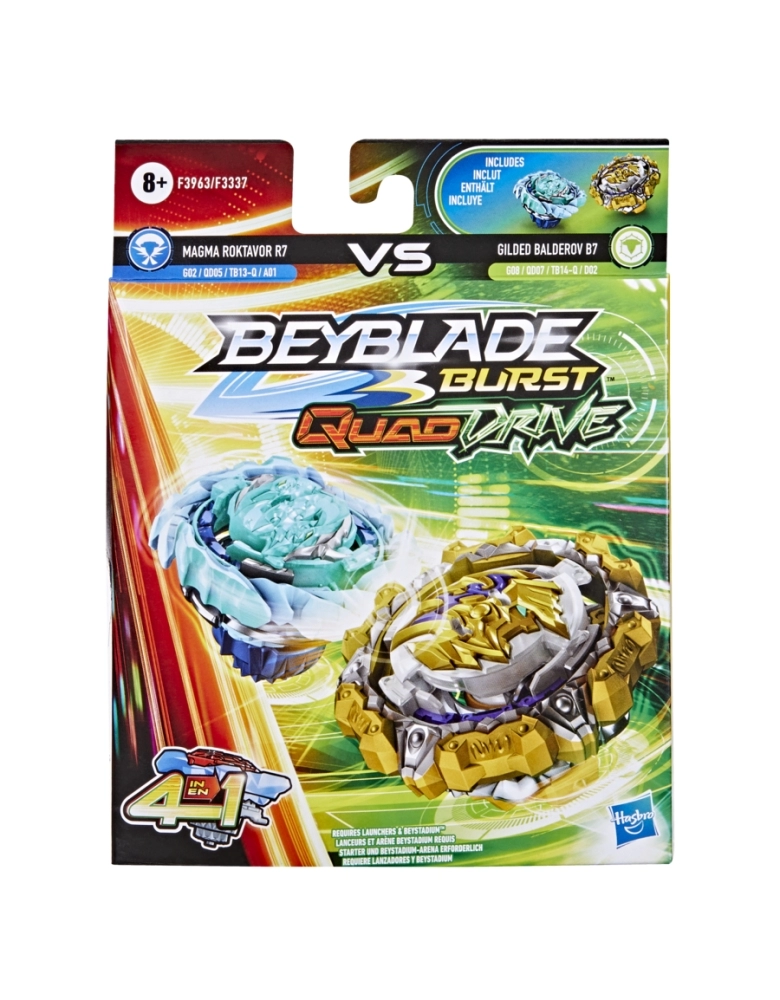 Os piões QuadDrive podem ser configurados de 4 maneiras e podem ser personalizados como nunca antes para ganhar maiores vantagens na batalha. São 4 estratégias, 4 modos de batalhas, 4 maneiras de vencer. É hora de treinar para se tornar o campeão da arena com os piões Magma Roktavor R7 G02 QD05 TB13-Q A01 e Gilded Balderov B7 G08 QD07 TB14-Q D02. O jogador personaliza o pião para os modos Core e Apex ou para os modos Core + e Apex +, e tenta ativar o poder da tecnologia avançada QuadDrive na arena QuadDrive Beystadium (a arena Beystadium é vendida separadamente). Escanear o código nos piões QuadDrive para liberar o pião em uma batalha virtual no aplicativo Beyblade Burst! Batalhas radicais com as arenas Beyblade Burst Beystadiumlançadores e piões numa grande jornada Beyblade.
