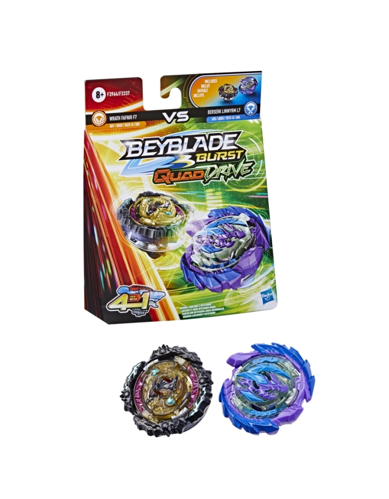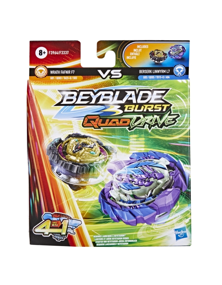 Os piões QuadDrive podem ser configurados de 4 maneiras e podem ser personalizados como nunca antes para ganhar maiores vantagens na batalha. São 4 estratégias, 4 modos de batalhas, 4 maneiras de vencer. É hora de treinar para se tornar o campeão da arena com os piões Magma Roktavor R7 G02 QD05 TB13-Q A01 e Gilded Balderov B7 G08 QD07 TB14-Q D02. O jogador personaliza o pião para os modos Core e Apex ou para os modos Core + e Apex +, e tenta ativar o poder da tecnologia avançada QuadDrive na arena QuadDrive Beystadium (a arena Beystadium é vendida separadamente). Escanear o código nos piões QuadDrive para liberar o pião em uma batalha virtual no aplicativo Beyblade Burst! Batalhas radicais com as arenas Beyblade Burst Beystadiumlançadores e piões numa grande jornada Beyblade.