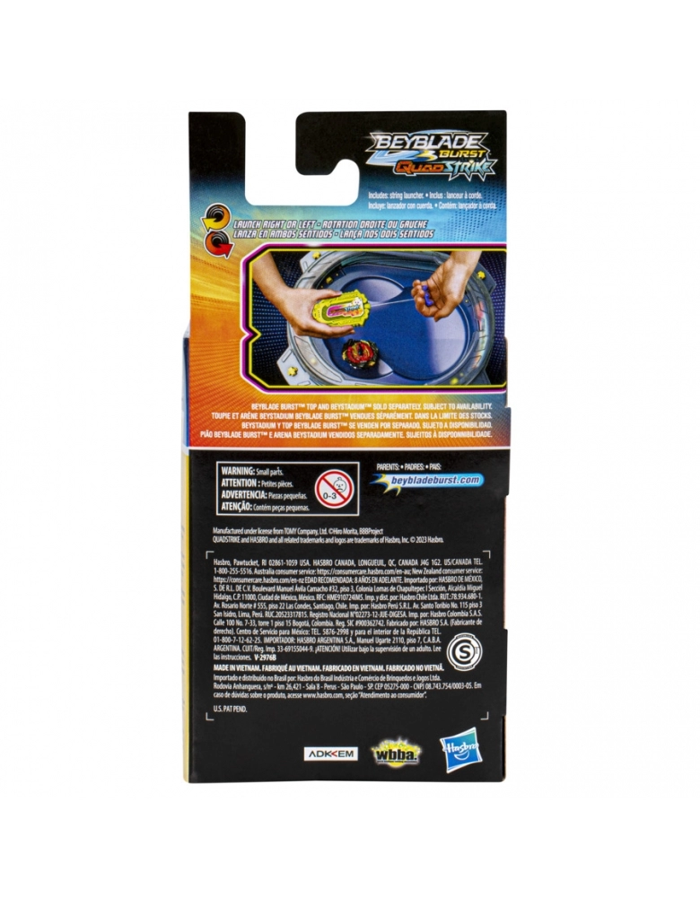Beyblade Burst QuadStrike lança os jogadores no futuro da batalha de Beyblade com piões 4 em 1. Aumentar as chances de vitória com o lançador QuadStrike String. O lançador Beyblade permite lançamentos rápidos sem a haste dentada. Basta mover o botão no lançador para mudar o modo do giro e lançar à direita ou à esquerda. (Piões Beyblade Burst necessários. Não incluídos. Piões vendidos separadamente, sujeitos à disponibilidade) Os jogadores devem buscar a melhor maneira de configurar o pião para a batalha na arena Beystadium QuadStrike (arena vendida separadamente, sujeita à disponibilidade). Basta escanear o código na arena Beystadium QuadStrike para desbloquear o lançador no aplicativo Beyblade Burst! Os brinquedos Beyblade Burst QuadStrike são excelente presentes para meninos e meninas a partir dos 8 anos. Batalhas radicais com as arenas Beyblade Burst Beystadium, lançadores e piões numa grande jornada Beyblade (Vendidos separadamente. Sujeitos à disponibilidade.) Hasbro and all related terms are trademarks of Hasbro, Inc.