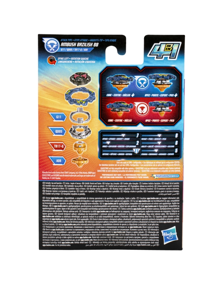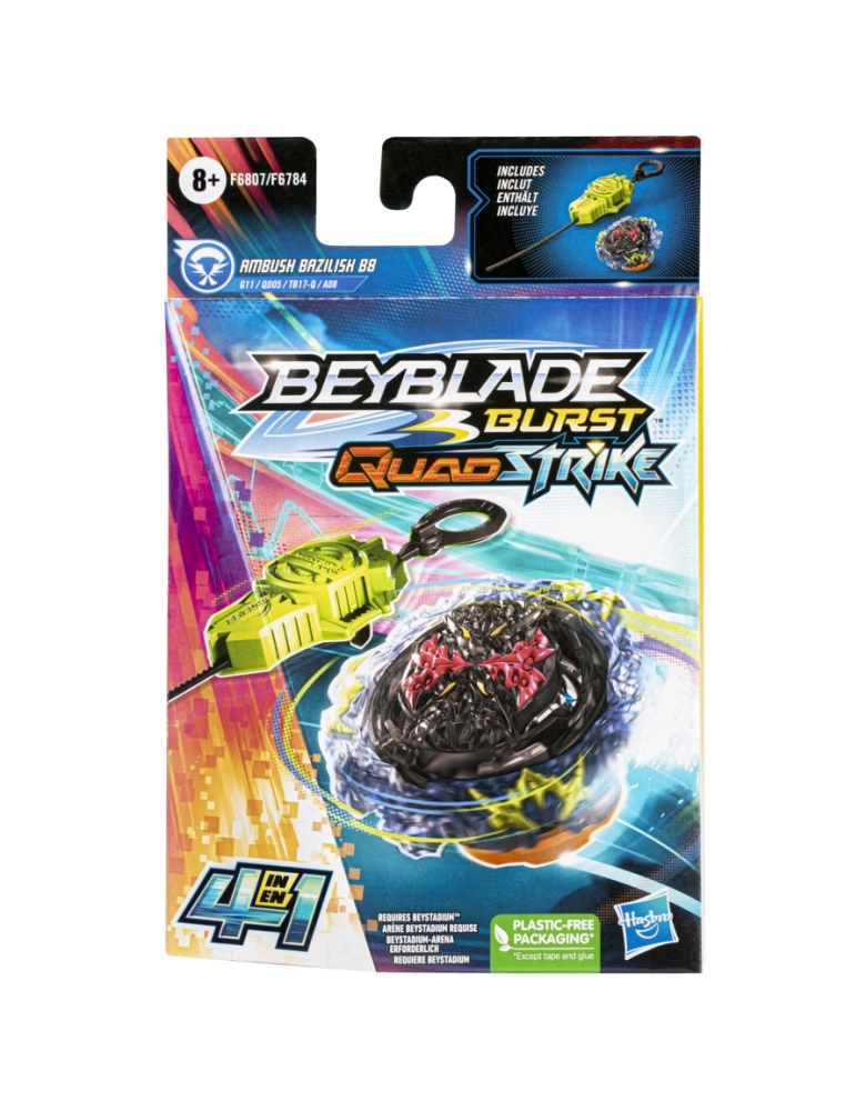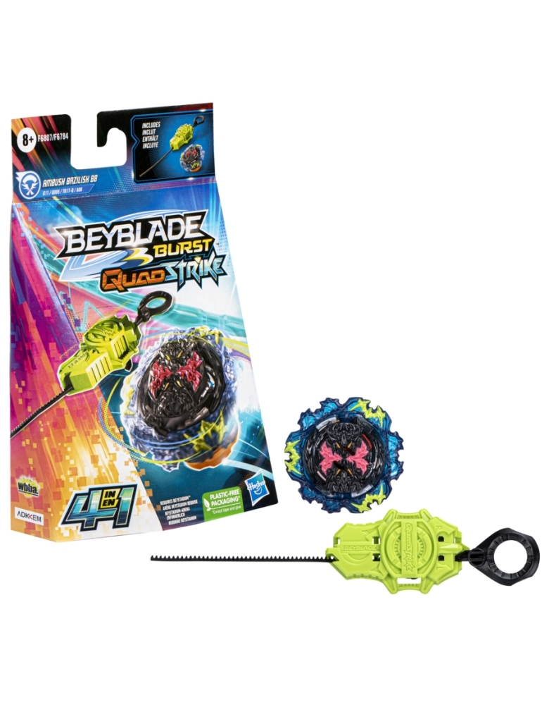O nível da batalha subiu! Com lançadores e piões QuadStrike com pontas blindadas, o kit inicial Beyblade Burst QuadStrike leva meninos e meninas a partir dos 8 anos a batalhas épicas, golpes ferozes e derrota dos oponentes. O pião pode ser configurado de 4 maneiras para se adaptar a estratégias diferentes. 4 modos de batalha, 4 formas de vencer. Basta analisar o oponente e escolher a modificação para garantir a vitória. É hora de treinar para se tornar o campeão da arena com o pião de giro à esquerda Beyblade Burst QuadStrike Ambush Bazilisk B8 G11 QD05 TB17-Q A08. O jogador personaliza o pião para os modos Core e Apex para o tipo equilíbrio ou modos Core+ e Apex+ para o tipo ataque, e tenta ativar o poder da tecnologia avançada QuadStrike na arena QuadStrike Beystadium (a arena Beystadium é vendida separadamente, sujeita à disponibilidade). Escanear o código nos piões QuadStrike para liberar o pião em uma batalha virtual no aplicativo Beyblade Burst! Hasbro and all related terms are trademarks of Hasbro, Inc.